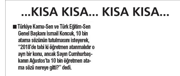 10 Bin Öğretmen Atama Sözü Nereye Gitti? – Türkiye Yeni Çağ Basında TES 18 Eylül 2017 FacebookTwitterWhatsAppLinkedin A- A A+ Son Haberler Haberler TÜRK DÜNYASINDA EĞİTİM ALANINDA İŞBİRLİĞİ SÜRÜYOR Türk Eğitim-Sen ve Uluslararası Avrasya Eğitim Sendikaları Birliği Genel Başkanı Talip Geylan ile Kırgızistan... 19 Şubat 2026 Tüm Haberler NORM FAZLASI RE’SEN ATAMADA YENİ BİR YÜRÜTMEYİ DURDURMA KARARI Sendikamız üyesinin, norm kadro fazlası olduğu gerekçesiyle re’sen, aile birliği mazeretine uygun olmayan bir... 17 Şubat 2026 Haberler GENEL BAŞKAN TALİP GEYLAN GÜVEN TAZELEDİ 15 Şubat 2026 tarihinde Ankara’da yapılan Türk Eğitim-Sen 8. Olağan Merkez Genel Kurulu'nda mevcut... 15 Şubat 2026 Haberler 8. OLAĞAN MERKEZ GENEL KURULUMUZ COŞKU İLE GERÇEKLEŞTİ Türk Eğitim Sen 8. Olağan Merkez Genel Kurulu, 15 Şubat 2026 tarihinde Ankara’da coşku... 15 Şubat 2026
