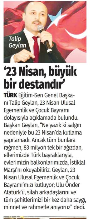23 Nisan Büyük Bir Destandır – Türkgün Basında TES 23 Nisan 2020 FacebookTwitterWhatsAppLinkedin A- A A+ Son Haberler Haberler GENEL BAŞKAN TALİP GEYLAN GÜVEN TAZELEDİ 15 Şubat 2026 tarihinde Ankara’da yapılan Türk Eğitim-Sen 8. Olağan Merkez Genel Kurulu'nda mevcut... 15 Şubat 2026 Haberler 8. OLAĞAN MERKEZ GENEL KURULUMUZ COŞKU İLE GERÇEKLEŞTİ Türk Eğitim Sen 8. Olağan Merkez Genel Kurulu, 15 Şubat 2026 tarihinde Ankara’da coşku... 15 Şubat 2026 Haberler YÖNETİCİ GÖREVLENDİRME YÖNETMELİĞİNE DAVA AÇTIK Türk Eğitim Sen, 30.01.2026 tarih ve 33153 sayılı resmi gazete yayımlanan Milli Eğitim Bakanlığı... 12 Şubat 2026 Haberler IRAK TÜRKMEN EĞİTİMCİLERİNDEN GENEL BAŞKAN TALİP GEYLAN’A ANLAMLI ZİYARET Irak Türkmen Eğitimciler Öğretmen Örgütü Başkanı Ali Gülboy ve beraberindeki heyet, 11 Şubat 2026... 11 Şubat 2026