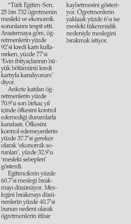 24 Kasım Öğretmenler Günü Anketi – Haber Ekspres Basında TES 24 Kasım 2017 FacebookTwitterWhatsAppLinkedin A- A A+ Son Haberler Tüm Haberler NORM FAZLASI RE’SEN ATAMADA YENİ BİR YÜRÜTMEYİ DURDURMA KARARI Sendikamız üyesinin, norm kadro fazlası olduğu gerekçesiyle re’sen, aile birliği mazeretine uygun olmayan bir... 17 Şubat 2026 Haberler GENEL BAŞKAN TALİP GEYLAN GÜVEN TAZELEDİ 15 Şubat 2026 tarihinde Ankara’da yapılan Türk Eğitim-Sen 8. Olağan Merkez Genel Kurulu'nda mevcut... 15 Şubat 2026 Haberler 8. OLAĞAN MERKEZ GENEL KURULUMUZ COŞKU İLE GERÇEKLEŞTİ Türk Eğitim Sen 8. Olağan Merkez Genel Kurulu, 15 Şubat 2026 tarihinde Ankara’da coşku... 15 Şubat 2026 Haberler YÖNETİCİ GÖREVLENDİRME YÖNETMELİĞİNE DAVA AÇTIK Türk Eğitim Sen, 30.01.2026 tarih ve 33153 sayılı resmi gazete yayımlanan Milli Eğitim Bakanlığı... 12 Şubat 2026