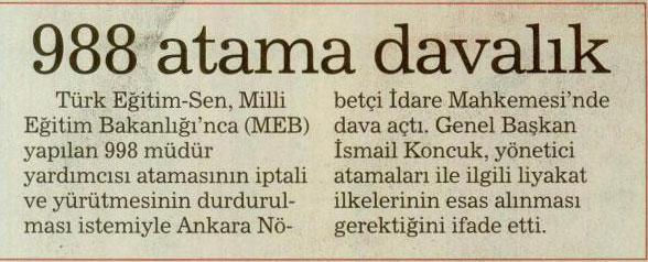 988 Atama Davalık – Habertürk Basında TES 19 Temmuz 2009 FacebookTwitterWhatsAppLinkedin A- A A+ Son Haberler Haberler GENEL BAŞKAN TALİP GEYLAN GÜVEN TAZELEDİ 15 Şubat 2026 tarihinde Ankara’da yapılan Türk Eğitim-Sen 8. Olağan Merkez Genel Kurulu'nda mevcut... 15 Şubat 2026 Haberler 8. OLAĞAN MERKEZ GENEL KURULUMUZ COŞKU İLE GERÇEKLEŞTİ Türk Eğitim Sen 8. Olağan Merkez Genel Kurulu, 15 Şubat 2026 tarihinde Ankara’da coşku... 15 Şubat 2026 Haberler YÖNETİCİ GÖREVLENDİRME YÖNETMELİĞİNE DAVA AÇTIK Türk Eğitim Sen, 30.01.2026 tarih ve 33153 sayılı resmi gazete yayımlanan Milli Eğitim Bakanlığı... 12 Şubat 2026 Haberler IRAK TÜRKMEN EĞİTİMCİLERİNDEN GENEL BAŞKAN TALİP GEYLAN’A ANLAMLI ZİYARET Irak Türkmen Eğitimciler Öğretmen Örgütü Başkanı Ali Gülboy ve beraberindeki heyet, 11 Şubat 2026... 11 Şubat 2026