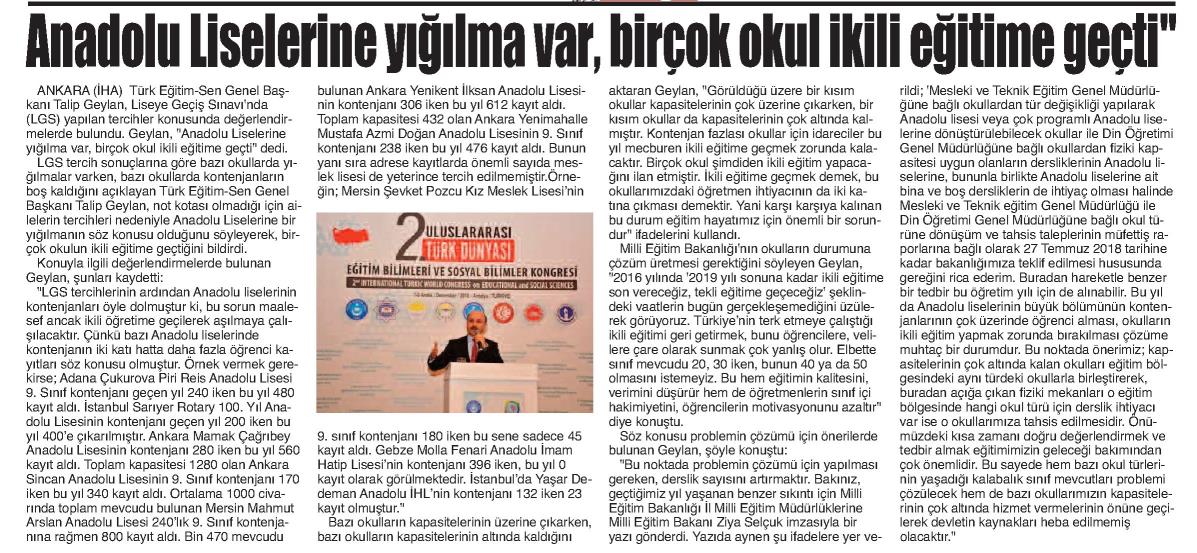 Anadolu Liselerinde Yığılma Var, Birçok Okul İkili Eğitime Geçti – Bölge Basında TES 31 Temmuz 2019 FacebookTwitterWhatsAppLinkedin A- A A+ Son Haberler Haberler GENEL BAŞKAN TALİP GEYLAN GÜVEN TAZELEDİ 15 Şubat 2026 tarihinde Ankara’da yapılan Türk Eğitim-Sen 8. Olağan Merkez Genel Kurulu'nda mevcut... 15 Şubat 2026 Haberler 8. OLAĞAN MERKEZ GENEL KURULUMUZ COŞKU İLE GERÇEKLEŞTİ Türk Eğitim Sen 8. Olağan Merkez Genel Kurulu, 15 Şubat 2026 tarihinde Ankara’da coşku... 15 Şubat 2026 Haberler YÖNETİCİ GÖREVLENDİRME YÖNETMELİĞİNE DAVA AÇTIK Türk Eğitim Sen, 30.01.2026 tarih ve 33153 sayılı resmi gazete yayımlanan Milli Eğitim Bakanlığı... 12 Şubat 2026 Haberler IRAK TÜRKMEN EĞİTİMCİLERİNDEN GENEL BAŞKAN TALİP GEYLAN’A ANLAMLI ZİYARET Irak Türkmen Eğitimciler Öğretmen Örgütü Başkanı Ali Gülboy ve beraberindeki heyet, 11 Şubat 2026... 11 Şubat 2026