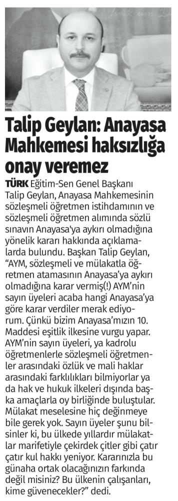 Anayasa Mahkemesi Haksızlığa Onay Veremez – Türkgün Basında TES 11 Nisan 2021 FacebookTwitterWhatsAppLinkedin A- A A+ Son Haberler Haberler YÖNETİCİ GÖREVLENDİRME YÖNETMELİĞİNE DAVA AÇTIK Türk Eğitim Sen, 30.01.2026 tarih ve 33153 sayılı resmi gazete yayımlanan Milli Eğitim Bakanlığı... 12 Şubat 2026 Haberler IRAK TÜRKMEN EĞİTİMCİLERİNDEN GENEL BAŞKAN TALİP GEYLAN’A ANLAMLI ZİYARET Irak Türkmen Eğitimciler Öğretmen Örgütü Başkanı Ali Gülboy ve beraberindeki heyet, 11 Şubat 2026... 11 Şubat 2026 Haberler ÖZEL EĞİTİM ANAOKULLARINDA GÖREV YAPAN ÖZEL EĞİTİM ÖĞRETMENLERİNE DE HAFTADA 1 SAAT EK DERS... 11 Şubat 2026 Haberler TÜRK EĞİTİM SEN ÜYELERİNE;MEB EKYS 2026 YAZILI SINAVINA HAZIRLIK DUYURUSU 2026 yılı Millî Eğitim Bakanlığı Eğitim Kurumlarına Yönetici Seçme Sınavı (MEB EKYS) kapsamında uygulanacak... 10 Şubat 2026