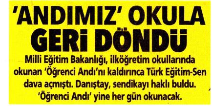 Andımız Okula Geri Döndü – Posta Basında TES 19 Ekim 2018 FacebookTwitterWhatsAppLinkedin A- A A+ Son Haberler Tüm Haberler NORM FAZLASI RE’SEN ATAMADA YENİ BİR YÜRÜTMEYİ DURDURMA KARARI Sendikamız üyesinin, norm kadro fazlası olduğu gerekçesiyle re’sen, aile birliği mazeretine uygun olmayan bir... 17 Şubat 2026 Haberler GENEL BAŞKAN TALİP GEYLAN GÜVEN TAZELEDİ 15 Şubat 2026 tarihinde Ankara’da yapılan Türk Eğitim-Sen 8. Olağan Merkez Genel Kurulu'nda mevcut... 15 Şubat 2026 Haberler 8. OLAĞAN MERKEZ GENEL KURULUMUZ COŞKU İLE GERÇEKLEŞTİ Türk Eğitim Sen 8. Olağan Merkez Genel Kurulu, 15 Şubat 2026 tarihinde Ankara’da coşku... 15 Şubat 2026 Haberler YÖNETİCİ GÖREVLENDİRME YÖNETMELİĞİNE DAVA AÇTIK Türk Eğitim Sen, 30.01.2026 tarih ve 33153 sayılı resmi gazete yayımlanan Milli Eğitim Bakanlığı... 12 Şubat 2026