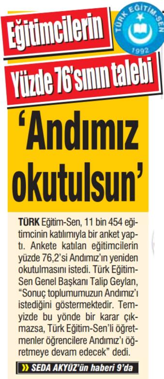 Andımız Okutulsun – 24 Saat Basında TES 23 Kasım 2018 FacebookTwitterWhatsAppLinkedin A- A A+ Son Haberler Tüm Haberler NORM FAZLASI RE’SEN ATAMADA YENİ BİR YÜRÜTMEYİ DURDURMA KARARI Sendikamız üyesinin, norm kadro fazlası olduğu gerekçesiyle re’sen, aile birliği mazeretine uygun olmayan bir... 17 Şubat 2026 Haberler GENEL BAŞKAN TALİP GEYLAN GÜVEN TAZELEDİ 15 Şubat 2026 tarihinde Ankara’da yapılan Türk Eğitim-Sen 8. Olağan Merkez Genel Kurulu'nda mevcut... 15 Şubat 2026 Haberler 8. OLAĞAN MERKEZ GENEL KURULUMUZ COŞKU İLE GERÇEKLEŞTİ Türk Eğitim Sen 8. Olağan Merkez Genel Kurulu, 15 Şubat 2026 tarihinde Ankara’da coşku... 15 Şubat 2026 Haberler YÖNETİCİ GÖREVLENDİRME YÖNETMELİĞİNE DAVA AÇTIK Türk Eğitim Sen, 30.01.2026 tarih ve 33153 sayılı resmi gazete yayımlanan Milli Eğitim Bakanlığı... 12 Şubat 2026