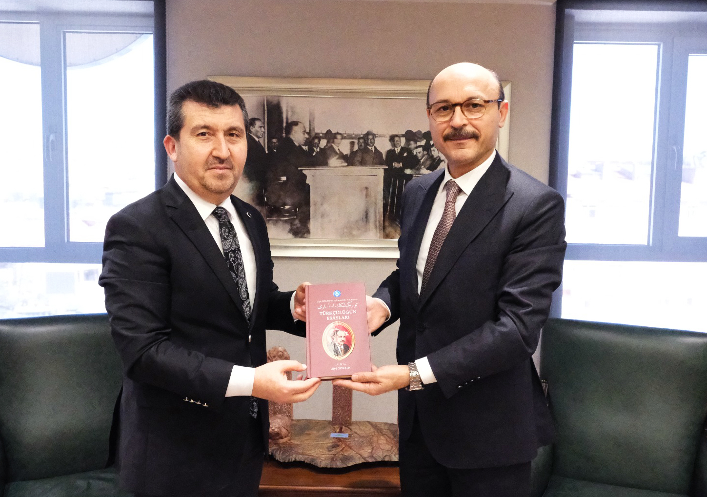 Genel Başkanımız Talip Geylan Rektör Arıcı’ya, Türk Eğitim-Sen’in, Ziya Gökalp’in vefatının 100. yılı anısına, Osmanlı Türkçesi ilk baskısı ve günümüz harfleriyle yeniden basarak hazırladığı “Türkçülüğün Esasları” kitabını takdim etti.