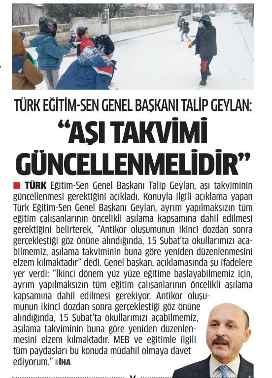 Aşı Takvimi Güncellenmelidir – Milli Gazete Basında TES 19 Ocak 2021 FacebookTwitterWhatsAppLinkedin A- A A+ Son Haberler Haberler YÖNETİCİ GÖREVLENDİRME YÖNETMELİĞİNE DAVA AÇTIK Türk Eğitim Sen, 30.01.2026 tarih ve 33153 sayılı resmi gazete yayımlanan Milli Eğitim Bakanlığı... 12 Şubat 2026 Haberler IRAK TÜRKMEN EĞİTİMCİLERİNDEN GENEL BAŞKAN TALİP GEYLAN’A ANLAMLI ZİYARET Irak Türkmen Eğitimciler Öğretmen Örgütü Başkanı Ali Gülboy ve beraberindeki heyet, 11 Şubat 2026... 11 Şubat 2026 Haberler ÖZEL EĞİTİM ANAOKULLARINDA GÖREV YAPAN ÖZEL EĞİTİM ÖĞRETMENLERİNE DE HAFTADA 1 SAAT EK DERS... 11 Şubat 2026 Haberler TÜRK EĞİTİM SEN ÜYELERİNE;MEB EKYS 2026 YAZILI SINAVINA HAZIRLIK DUYURUSU 2026 yılı Millî Eğitim Bakanlığı Eğitim Kurumlarına Yönetici Seçme Sınavı (MEB EKYS) kapsamında uygulanacak... 10 Şubat 2026