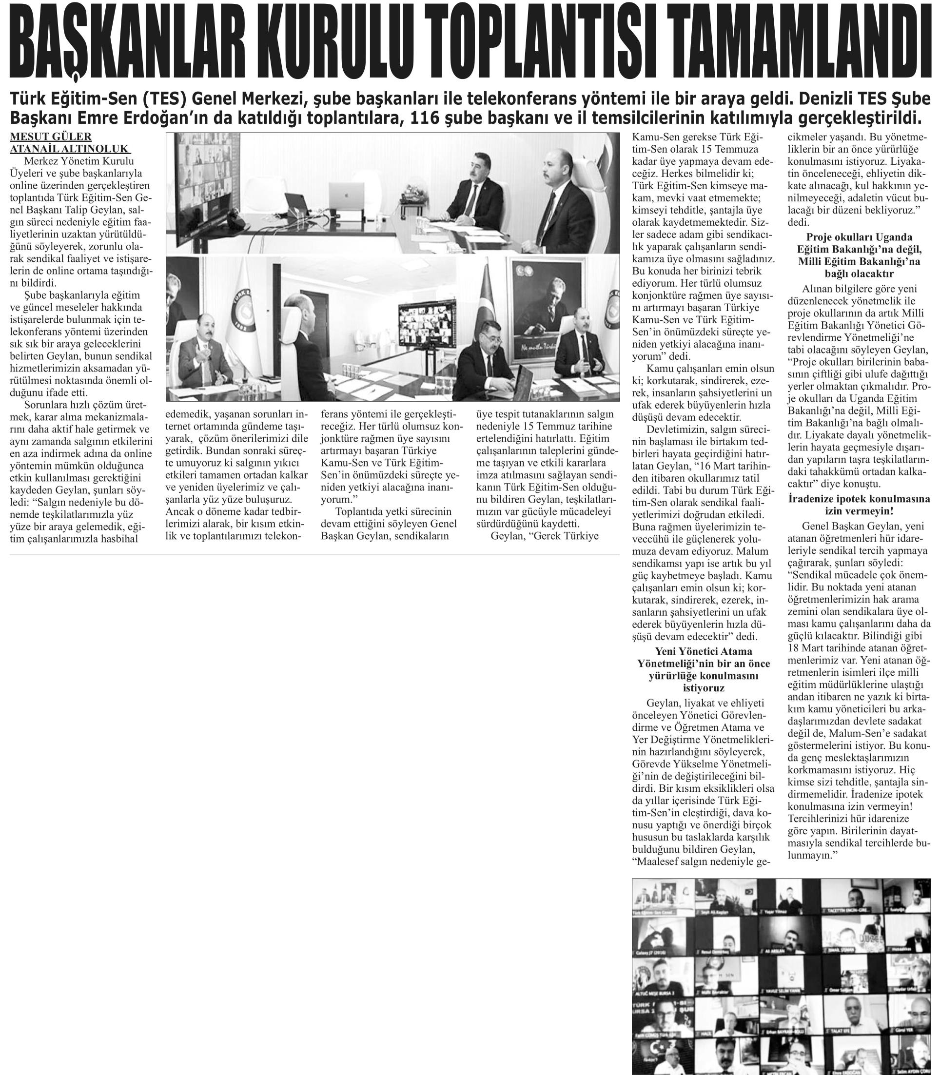 Başkanlar Kurulu Toplantısı Tamamlandı – Yeni Olay Basında TES 27 Haziran 2020 FacebookTwitterWhatsAppLinkedin A- A A+ Son Haberler Haberler YÖNETİCİ GÖREVLENDİRME YÖNETMELİĞİNE DAVA AÇTIK Türk Eğitim Sen, 30.01.2026 tarih ve 33153 sayılı resmi gazete yayımlanan Milli Eğitim Bakanlığı... 12 Şubat 2026 Haberler IRAK TÜRKMEN EĞİTİMCİLERİNDEN GENEL BAŞKAN TALİP GEYLAN’A ANLAMLI ZİYARET Irak Türkmen Eğitimciler Öğretmen Örgütü Başkanı Ali Gülboy ve beraberindeki heyet, 11 Şubat 2026... 11 Şubat 2026 Haberler ÖZEL EĞİTİM ANAOKULLARINDA GÖREV YAPAN ÖZEL EĞİTİM ÖĞRETMENLERİNE DE HAFTADA 1 SAAT EK DERS... 11 Şubat 2026 Haberler TÜRK EĞİTİM SEN ÜYELERİNE;MEB EKYS 2026 YAZILI SINAVINA HAZIRLIK DUYURUSU 2026 yılı Millî Eğitim Bakanlığı Eğitim Kurumlarına Yönetici Seçme Sınavı (MEB EKYS) kapsamında uygulanacak... 10 Şubat 2026
