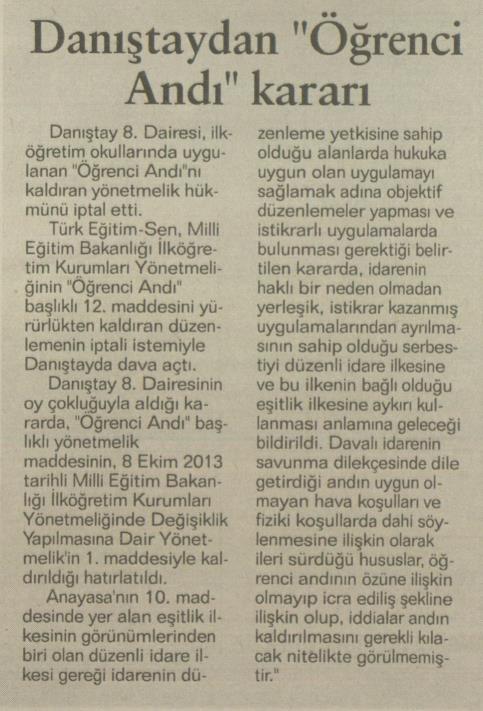 Danıştay`dan Öğrenci Andı Kararı – Vatan Kıbrıs Basında TES 19 Ekim 2018 FacebookTwitterWhatsAppLinkedin A- A A+ Son Haberler Tüm Haberler NORM FAZLASI RE’SEN ATAMADA YENİ BİR YÜRÜTMEYİ DURDURMA KARARI Sendikamız üyesinin, norm kadro fazlası olduğu gerekçesiyle re’sen, aile birliği mazeretine uygun olmayan bir... 17 Şubat 2026 Haberler GENEL BAŞKAN TALİP GEYLAN GÜVEN TAZELEDİ 15 Şubat 2026 tarihinde Ankara’da yapılan Türk Eğitim-Sen 8. Olağan Merkez Genel Kurulu'nda mevcut... 15 Şubat 2026 Haberler 8. OLAĞAN MERKEZ GENEL KURULUMUZ COŞKU İLE GERÇEKLEŞTİ Türk Eğitim Sen 8. Olağan Merkez Genel Kurulu, 15 Şubat 2026 tarihinde Ankara’da coşku... 15 Şubat 2026 Haberler YÖNETİCİ GÖREVLENDİRME YÖNETMELİĞİNE DAVA AÇTIK Türk Eğitim Sen, 30.01.2026 tarih ve 33153 sayılı resmi gazete yayımlanan Milli Eğitim Bakanlığı... 12 Şubat 2026