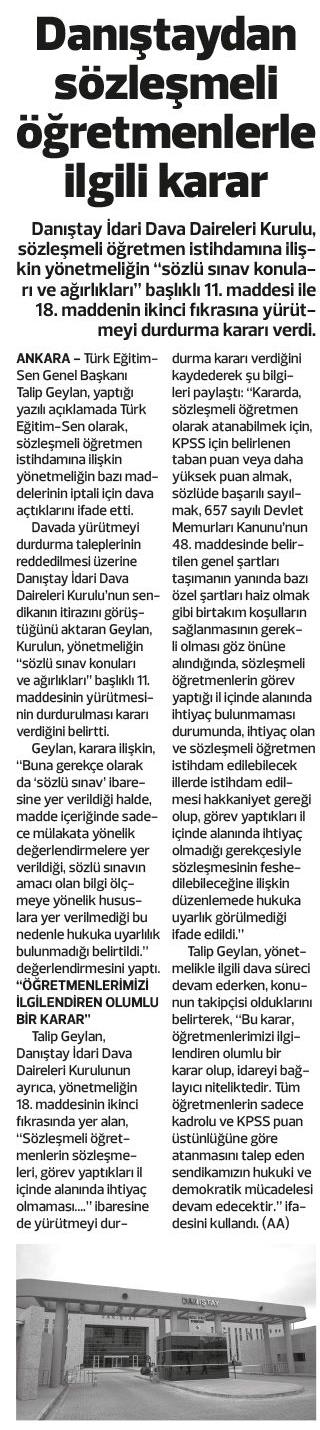 Danıştaydan Sözleşmeli Öğretmenlerle İlgili Karar – Doğru Haber Basında TES 20 Mart 2018 FacebookTwitterWhatsAppLinkedin A- A A+ Son Haberler Tüm Haberler NORM FAZLASI RE’SEN ATAMADA YENİ BİR YÜRÜTMEYİ DURDURMA KARARI Sendikamız üyesinin, norm kadro fazlası olduğu gerekçesiyle re’sen, aile birliği mazeretine uygun olmayan bir... 17 Şubat 2026 Haberler GENEL BAŞKAN TALİP GEYLAN GÜVEN TAZELEDİ 15 Şubat 2026 tarihinde Ankara’da yapılan Türk Eğitim-Sen 8. Olağan Merkez Genel Kurulu'nda mevcut... 15 Şubat 2026 Haberler 8. OLAĞAN MERKEZ GENEL KURULUMUZ COŞKU İLE GERÇEKLEŞTİ Türk Eğitim Sen 8. Olağan Merkez Genel Kurulu, 15 Şubat 2026 tarihinde Ankara’da coşku... 15 Şubat 2026 Haberler YÖNETİCİ GÖREVLENDİRME YÖNETMELİĞİNE DAVA AÇTIK Türk Eğitim Sen, 30.01.2026 tarih ve 33153 sayılı resmi gazete yayımlanan Milli Eğitim Bakanlığı... 12 Şubat 2026