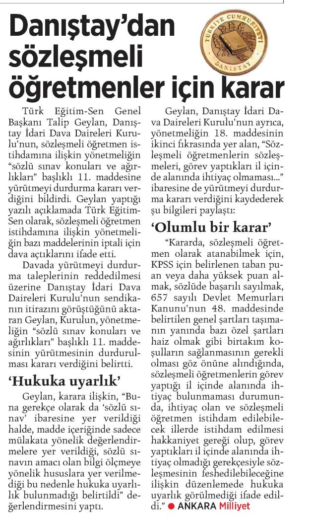 Danıştaydan Sözleşmeli Öğretmenlerle İlgili Karar – Milliyet Basında TES 20 Mart 2018 FacebookTwitterWhatsAppLinkedin A- A A+ Son Haberler Tüm Haberler NORM FAZLASI RE’SEN ATAMADA YENİ BİR YÜRÜTMEYİ DURDURMA KARARI Sendikamız üyesinin, norm kadro fazlası olduğu gerekçesiyle re’sen, aile birliği mazeretine uygun olmayan bir... 17 Şubat 2026 Haberler GENEL BAŞKAN TALİP GEYLAN GÜVEN TAZELEDİ 15 Şubat 2026 tarihinde Ankara’da yapılan Türk Eğitim-Sen 8. Olağan Merkez Genel Kurulu'nda mevcut... 15 Şubat 2026 Haberler 8. OLAĞAN MERKEZ GENEL KURULUMUZ COŞKU İLE GERÇEKLEŞTİ Türk Eğitim Sen 8. Olağan Merkez Genel Kurulu, 15 Şubat 2026 tarihinde Ankara’da coşku... 15 Şubat 2026 Haberler YÖNETİCİ GÖREVLENDİRME YÖNETMELİĞİNE DAVA AÇTIK Türk Eğitim Sen, 30.01.2026 tarih ve 33153 sayılı resmi gazete yayımlanan Milli Eğitim Bakanlığı... 12 Şubat 2026