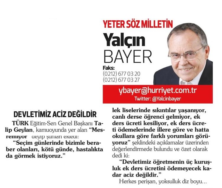 Devletimiz Aciz Değildir – Hürriyet Basında TES 2 Aralık 2020 FacebookTwitterWhatsAppLinkedin A- A A+ Son Haberler Haberler YÖNETİCİ GÖREVLENDİRME YÖNETMELİĞİNE DAVA AÇTIK Türk Eğitim Sen, 30.01.2026 tarih ve 33153 sayılı resmi gazete yayımlanan Milli Eğitim Bakanlığı... 12 Şubat 2026 Haberler IRAK TÜRKMEN EĞİTİMCİLERİNDEN GENEL BAŞKAN TALİP GEYLAN’A ANLAMLI ZİYARET Irak Türkmen Eğitimciler Öğretmen Örgütü Başkanı Ali Gülboy ve beraberindeki heyet, 11 Şubat 2026... 11 Şubat 2026 Haberler ÖZEL EĞİTİM ANAOKULLARINDA GÖREV YAPAN ÖZEL EĞİTİM ÖĞRETMENLERİNE DE HAFTADA 1 SAAT EK DERS... 11 Şubat 2026 Haberler TÜRK EĞİTİM SEN ÜYELERİNE;MEB EKYS 2026 YAZILI SINAVINA HAZIRLIK DUYURUSU 2026 yılı Millî Eğitim Bakanlığı Eğitim Kurumlarına Yönetici Seçme Sınavı (MEB EKYS) kapsamında uygulanacak... 10 Şubat 2026