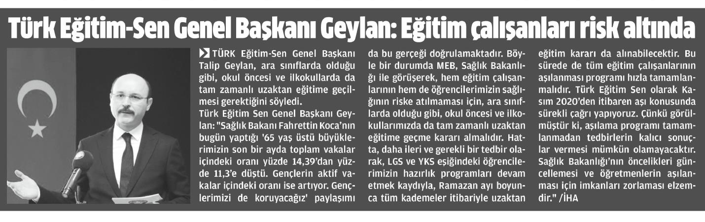 Eğitim Çalışanları Risk Altında – Yeni Devir Basında TES 6 Nisan 2021 FacebookTwitterWhatsAppLinkedin A- A A+ Son Haberler Haberler YÖNETİCİ GÖREVLENDİRME YÖNETMELİĞİNE DAVA AÇTIK Türk Eğitim Sen, 30.01.2026 tarih ve 33153 sayılı resmi gazete yayımlanan Milli Eğitim Bakanlığı... 12 Şubat 2026 Haberler IRAK TÜRKMEN EĞİTİMCİLERİNDEN GENEL BAŞKAN TALİP GEYLAN’A ANLAMLI ZİYARET Irak Türkmen Eğitimciler Öğretmen Örgütü Başkanı Ali Gülboy ve beraberindeki heyet, 11 Şubat 2026... 11 Şubat 2026 Haberler ÖZEL EĞİTİM ANAOKULLARINDA GÖREV YAPAN ÖZEL EĞİTİM ÖĞRETMENLERİNE DE HAFTADA 1 SAAT EK DERS... 11 Şubat 2026 Haberler TÜRK EĞİTİM SEN ÜYELERİNE;MEB EKYS 2026 YAZILI SINAVINA HAZIRLIK DUYURUSU 2026 yılı Millî Eğitim Bakanlığı Eğitim Kurumlarına Yönetici Seçme Sınavı (MEB EKYS) kapsamında uygulanacak... 10 Şubat 2026