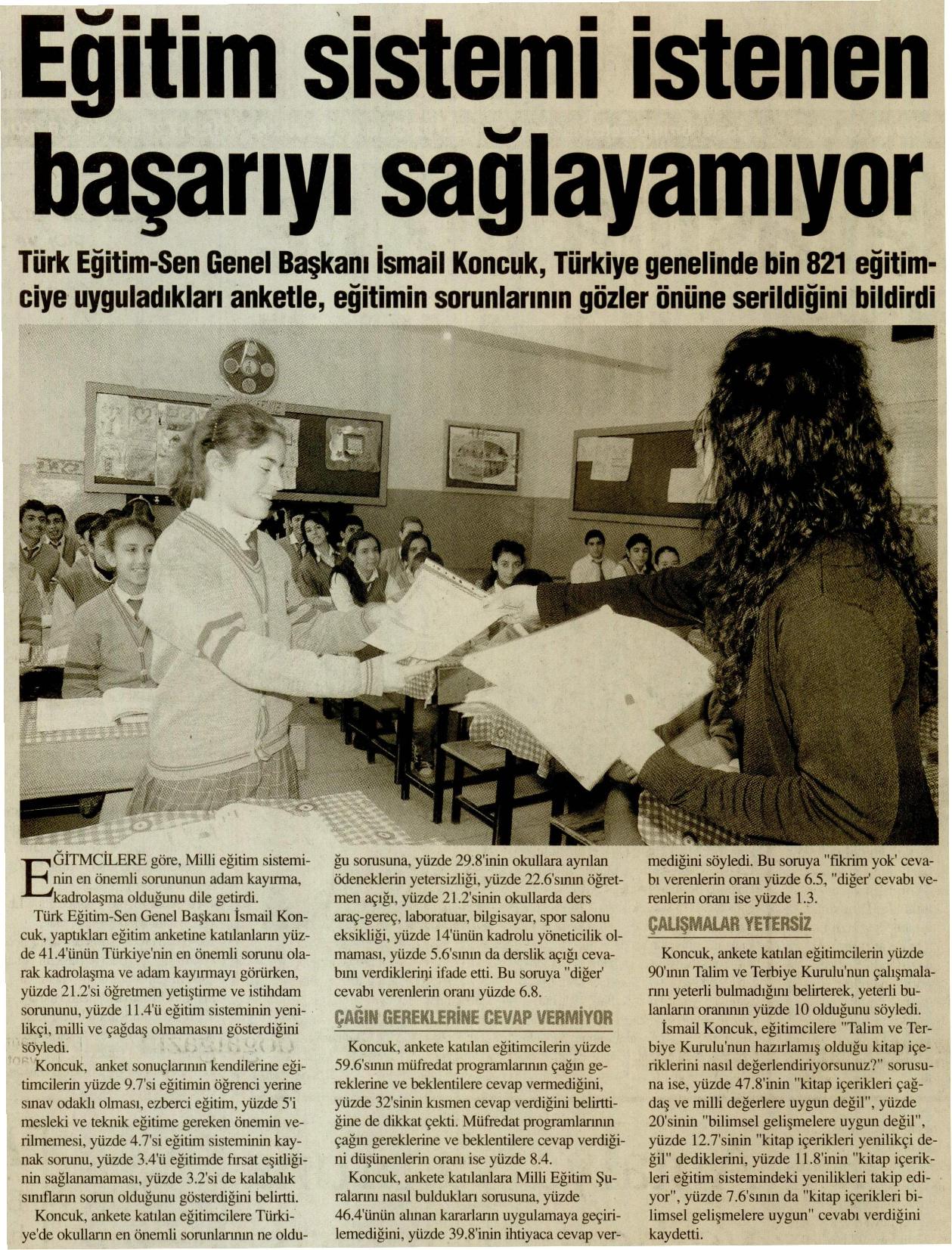 Eğitim Sistemi İstenen Başarıyı Sağlayamıyor – Bizim Gazete Basında TES 9 Şubat 2010 FacebookTwitterWhatsAppLinkedin A- A A+ Son Haberler Tüm Haberler NORM FAZLASI RE’SEN ATAMADA YENİ BİR YÜRÜTMEYİ DURDURMA KARARI Sendikamız üyesinin, norm kadro fazlası olduğu gerekçesiyle re’sen, aile birliği mazeretine uygun olmayan bir... 17 Şubat 2026 Haberler GENEL BAŞKAN TALİP GEYLAN GÜVEN TAZELEDİ 15 Şubat 2026 tarihinde Ankara’da yapılan Türk Eğitim-Sen 8. Olağan Merkez Genel Kurulu'nda mevcut... 15 Şubat 2026 Haberler 8. OLAĞAN MERKEZ GENEL KURULUMUZ COŞKU İLE GERÇEKLEŞTİ Türk Eğitim Sen 8. Olağan Merkez Genel Kurulu, 15 Şubat 2026 tarihinde Ankara’da coşku... 15 Şubat 2026 Haberler YÖNETİCİ GÖREVLENDİRME YÖNETMELİĞİNE DAVA AÇTIK Türk Eğitim Sen, 30.01.2026 tarih ve 33153 sayılı resmi gazete yayımlanan Milli Eğitim Bakanlığı... 12 Şubat 2026
