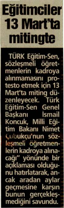 Eğitimciler 13 Mart’ta Mitingte – Güneş Basında TES 14 Şubat 2010 FacebookTwitterWhatsAppLinkedin A- A A+ Son Haberler Tüm Haberler NORM FAZLASI RE’SEN ATAMADA YENİ BİR YÜRÜTMEYİ DURDURMA KARARI Sendikamız üyesinin, norm kadro fazlası olduğu gerekçesiyle re’sen, aile birliği mazeretine uygun olmayan bir... 17 Şubat 2026 Haberler GENEL BAŞKAN TALİP GEYLAN GÜVEN TAZELEDİ 15 Şubat 2026 tarihinde Ankara’da yapılan Türk Eğitim-Sen 8. Olağan Merkez Genel Kurulu'nda mevcut... 15 Şubat 2026 Haberler 8. OLAĞAN MERKEZ GENEL KURULUMUZ COŞKU İLE GERÇEKLEŞTİ Türk Eğitim Sen 8. Olağan Merkez Genel Kurulu, 15 Şubat 2026 tarihinde Ankara’da coşku... 15 Şubat 2026 Haberler YÖNETİCİ GÖREVLENDİRME YÖNETMELİĞİNE DAVA AÇTIK Türk Eğitim Sen, 30.01.2026 tarih ve 33153 sayılı resmi gazete yayımlanan Milli Eğitim Bakanlığı... 12 Şubat 2026