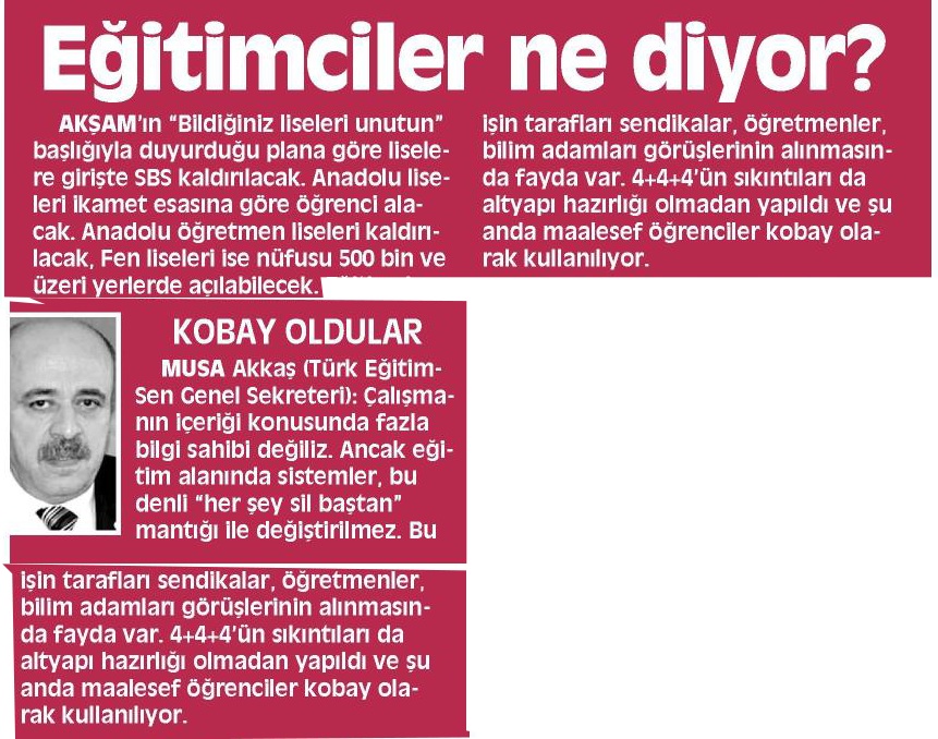 Eğitimciler Ne Diyor? – Akşam Basında TES 3 Ocak 2013 FacebookTwitterWhatsAppLinkedin A- A A+ Son Haberler Haberler İÇ CEPHEMİZİN SAĞLAM OLMASI İÇİN TÜRK EĞİTİM-SEN HER ZAMAN SORUMLULUK ALMIŞTIR Genel Sekreterimiz Selahattin Dolgun, 7 Mart tarihinde Ankara 10 No.lu Şubemizin iftar programına katıldı.... 9 Mart 2026 Tüm Haberler TÜRK EĞİTİM SEN ARA TATİL ANKETİNİN SONUÇLARINI AÇIKLADI 2025-2026 eğitim-öğretim yılı ikinci ara tatili 16 Mart tarihinde başlayacaktır. Bu süreçte ara tatillerin... 9 Mart 2026 Haberler SEMİNERLER ÇEVRİM İÇİ YAPILSIN Türk Eğitim Sen Genel Başkanı Talip Geylan, öğretmenlerimizin 16 Mart tarihinde başlayacak seminer programlarının,... 9 Mart 2026 Haberler ADANA ŞUBELERİMİZ ŞEHİT ÖĞRETMENLERİMİZ ANISINA FİDAN DİKTİ Türk Eğitim-Sen Adana şubeleri, görevi başındayken hayatını kaybeden öğretmen Fatma Nur Çelik ve tüm... 9 Mart 2026