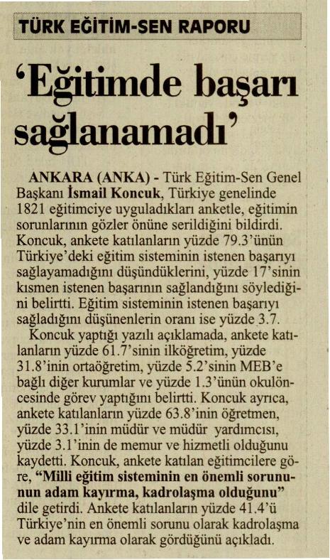 Eğitimde Başarı Sağlanamadı – Cumhuriyet Basında TES 8 Şubat 2010 FacebookTwitterWhatsAppLinkedin A- A A+ Son Haberler Tüm Haberler NORM FAZLASI RE’SEN ATAMADA YENİ BİR YÜRÜTMEYİ DURDURMA KARARI Sendikamız üyesinin, norm kadro fazlası olduğu gerekçesiyle re’sen, aile birliği mazeretine uygun olmayan bir... 17 Şubat 2026 Haberler GENEL BAŞKAN TALİP GEYLAN GÜVEN TAZELEDİ 15 Şubat 2026 tarihinde Ankara’da yapılan Türk Eğitim-Sen 8. Olağan Merkez Genel Kurulu'nda mevcut... 15 Şubat 2026 Haberler 8. OLAĞAN MERKEZ GENEL KURULUMUZ COŞKU İLE GERÇEKLEŞTİ Türk Eğitim Sen 8. Olağan Merkez Genel Kurulu, 15 Şubat 2026 tarihinde Ankara’da coşku... 15 Şubat 2026 Haberler YÖNETİCİ GÖREVLENDİRME YÖNETMELİĞİNE DAVA AÇTIK Türk Eğitim Sen, 30.01.2026 tarih ve 33153 sayılı resmi gazete yayımlanan Milli Eğitim Bakanlığı... 12 Şubat 2026