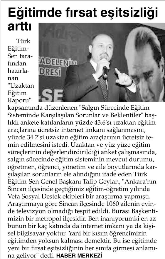 Eğitimde Fırsat Eşitsizliği Arttı – Yeni Mesaj Basında TES 14 Kasım 2020 FacebookTwitterWhatsAppLinkedin A- A A+ Son Haberler Haberler YÖNETİCİ GÖREVLENDİRME YÖNETMELİĞİNE DAVA AÇTIK Türk Eğitim Sen, 30.01.2026 tarih ve 33153 sayılı resmi gazete yayımlanan Milli Eğitim Bakanlığı... 12 Şubat 2026 Haberler IRAK TÜRKMEN EĞİTİMCİLERİNDEN GENEL BAŞKAN TALİP GEYLAN’A ANLAMLI ZİYARET Irak Türkmen Eğitimciler Öğretmen Örgütü Başkanı Ali Gülboy ve beraberindeki heyet, 11 Şubat 2026... 11 Şubat 2026 Haberler ÖZEL EĞİTİM ANAOKULLARINDA GÖREV YAPAN ÖZEL EĞİTİM ÖĞRETMENLERİNE DE HAFTADA 1 SAAT EK DERS... 11 Şubat 2026 Haberler TÜRK EĞİTİM SEN ÜYELERİNE;MEB EKYS 2026 YAZILI SINAVINA HAZIRLIK DUYURUSU 2026 yılı Millî Eğitim Bakanlığı Eğitim Kurumlarına Yönetici Seçme Sınavı (MEB EKYS) kapsamında uygulanacak... 10 Şubat 2026