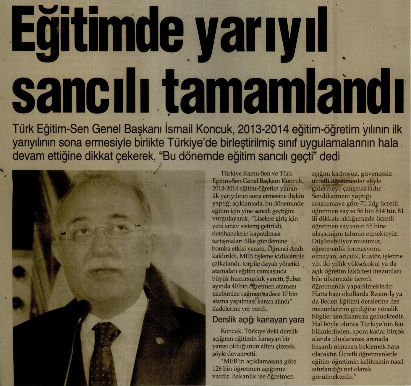 Eğitimde Yarıyıl Sancılı Tamamlandı – Yeni Mesaj Basında TES 24 Ocak 2014 FacebookTwitterWhatsAppLinkedin A- A A+ Son Haberler Haberler NEVRUZ, TÜRK MİLLETİNİN KADİM HAFIZASININ VE ORTAK İRADESİNİN SİMGESİDİR Türk milleti binlerce yıllık tarih yolculuğu boyunca sahip olduğu köklü kültürel miras, güçlü medeniyet... 21 Mart 2026 Haberler RAMAZAN BAYRAMIMIZ KUTLU OLSUN Türk Eğitim-Sen Genel Başkanı Talip Geylan, Ramazan Bayramı nedeniyle yayınladığı mesajında, bayramların toplumsal dayanışmayı... 19 Mart 2026 Haberler NORM FAZLASI RE’SEN ATAMADA YENİ YÜRÜTMEYİ DURDURMA KARARI Sendikamız üyesinin norm kadro fazlası olduğu gerekçesiyle re’sen, aile birliği mazeretine uygun olmayan bir... 17 Mart 2026 Haberler ÇANAKKALE, ŞEHİTLERİMİZİN KANIYLA YAZILAN DİRENİŞ DESTANIDIR. Türk Eğitim Sen Genel Başkanı Talip Geylan’ın, Çanakkale Zaferi dolayısıyla yaptığı basın açıklamasıdır. Çanakkale Zaferi; Milletimizin... 17 Mart 2026