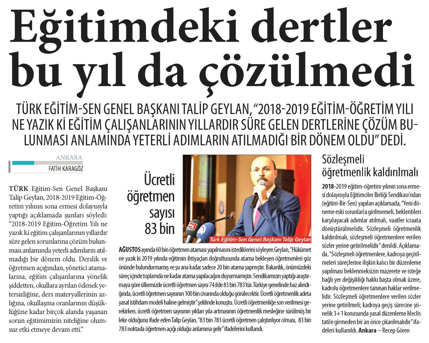 Eğitimdeki Dertler Bu Yıl da Çözülmedi – Yeni Asya Basında TES 15 Haziran 2019 FacebookTwitterWhatsAppLinkedin A- A A+ Son Haberler Tüm Haberler NORM FAZLASI RE’SEN ATAMADA YENİ BİR YÜRÜTMEYİ DURDURMA KARARI Sendikamız üyesinin, norm kadro fazlası olduğu gerekçesiyle re’sen, aile birliği mazeretine uygun olmayan bir... 17 Şubat 2026 Haberler GENEL BAŞKAN TALİP GEYLAN GÜVEN TAZELEDİ 15 Şubat 2026 tarihinde Ankara’da yapılan Türk Eğitim-Sen 8. Olağan Merkez Genel Kurulu'nda mevcut... 15 Şubat 2026 Haberler 8. OLAĞAN MERKEZ GENEL KURULUMUZ COŞKU İLE GERÇEKLEŞTİ Türk Eğitim Sen 8. Olağan Merkez Genel Kurulu, 15 Şubat 2026 tarihinde Ankara’da coşku... 15 Şubat 2026 Haberler YÖNETİCİ GÖREVLENDİRME YÖNETMELİĞİNE DAVA AÇTIK Türk Eğitim Sen, 30.01.2026 tarih ve 33153 sayılı resmi gazete yayımlanan Milli Eğitim Bakanlığı... 12 Şubat 2026