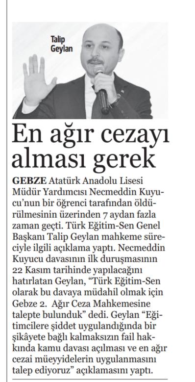 En Ağır Cezayı alması Gerek – Türkgün Basında TES 16 Kasım 2019 FacebookTwitterWhatsAppLinkedin A- A A+ Son Haberler Haberler GENEL BAŞKAN TALİP GEYLAN GÜVEN TAZELEDİ 15 Şubat 2026 tarihinde Ankara’da yapılan Türk Eğitim-Sen 8. Olağan Merkez Genel Kurulu'nda mevcut... 15 Şubat 2026 Haberler 8. OLAĞAN MERKEZ GENEL KURULUMUZ COŞKU İLE GERÇEKLEŞTİ Türk Eğitim Sen 8. Olağan Merkez Genel Kurulu, 15 Şubat 2026 tarihinde Ankara’da coşku... 15 Şubat 2026 Haberler YÖNETİCİ GÖREVLENDİRME YÖNETMELİĞİNE DAVA AÇTIK Türk Eğitim Sen, 30.01.2026 tarih ve 33153 sayılı resmi gazete yayımlanan Milli Eğitim Bakanlığı... 12 Şubat 2026 Haberler IRAK TÜRKMEN EĞİTİMCİLERİNDEN GENEL BAŞKAN TALİP GEYLAN’A ANLAMLI ZİYARET Irak Türkmen Eğitimciler Öğretmen Örgütü Başkanı Ali Gülboy ve beraberindeki heyet, 11 Şubat 2026... 11 Şubat 2026