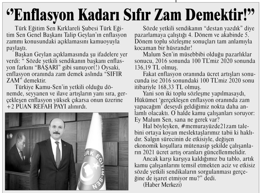 Enflasyon Kadarı Sıfır Zam Demektir – Demirköy İğneada Basında TES 13 Ocak 2021 FacebookTwitterWhatsAppLinkedin A- A A+ Son Haberler Haberler YÖNETİCİ GÖREVLENDİRME YÖNETMELİĞİNE DAVA AÇTIK Türk Eğitim Sen, 30.01.2026 tarih ve 33153 sayılı resmi gazete yayımlanan Milli Eğitim Bakanlığı... 12 Şubat 2026 Haberler IRAK TÜRKMEN EĞİTİMCİLERİNDEN GENEL BAŞKAN TALİP GEYLAN’A ANLAMLI ZİYARET Irak Türkmen Eğitimciler Öğretmen Örgütü Başkanı Ali Gülboy ve beraberindeki heyet, 11 Şubat 2026... 11 Şubat 2026 Haberler ÖZEL EĞİTİM ANAOKULLARINDA GÖREV YAPAN ÖZEL EĞİTİM ÖĞRETMENLERİNE DE HAFTADA 1 SAAT EK DERS... 11 Şubat 2026 Haberler TÜRK EĞİTİM SEN ÜYELERİNE;MEB EKYS 2026 YAZILI SINAVINA HAZIRLIK DUYURUSU 2026 yılı Millî Eğitim Bakanlığı Eğitim Kurumlarına Yönetici Seçme Sınavı (MEB EKYS) kapsamında uygulanacak... 10 Şubat 2026