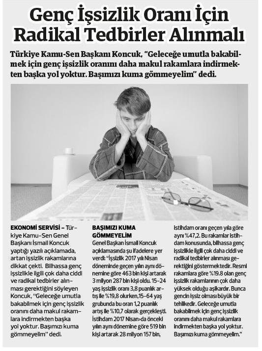 Genç İşsizlik Oranı İçin Radikal Tedbirler Alınmalı – Doğru Haber Basında TES 19 Temmuz 2017 FacebookTwitterWhatsAppLinkedin A- A A+ Son Haberler Haberler TÜRK DÜNYASINDA EĞİTİM ALANINDA İŞBİRLİĞİ SÜRÜYOR Türk Eğitim-Sen ve Uluslararası Avrasya Eğitim Sendikaları Birliği Genel Başkanı Talip Geylan ile Kırgızistan... 19 Şubat 2026 Tüm Haberler NORM FAZLASI RE’SEN ATAMADA YENİ BİR YÜRÜTMEYİ DURDURMA KARARI Sendikamız üyesinin, norm kadro fazlası olduğu gerekçesiyle re’sen, aile birliği mazeretine uygun olmayan bir... 17 Şubat 2026 Haberler GENEL BAŞKAN TALİP GEYLAN GÜVEN TAZELEDİ 15 Şubat 2026 tarihinde Ankara’da yapılan Türk Eğitim-Sen 8. Olağan Merkez Genel Kurulu'nda mevcut... 15 Şubat 2026 Haberler 8. OLAĞAN MERKEZ GENEL KURULUMUZ COŞKU İLE GERÇEKLEŞTİ Türk Eğitim Sen 8. Olağan Merkez Genel Kurulu, 15 Şubat 2026 tarihinde Ankara’da coşku... 15 Şubat 2026