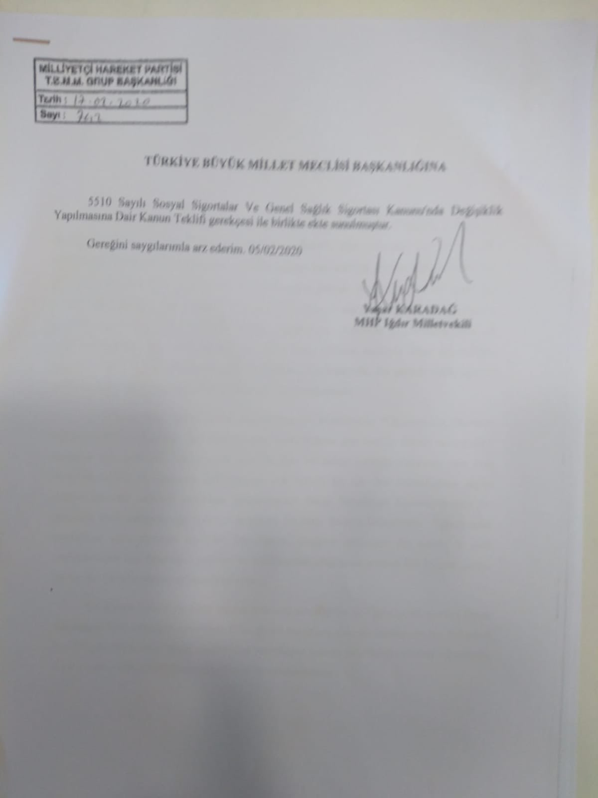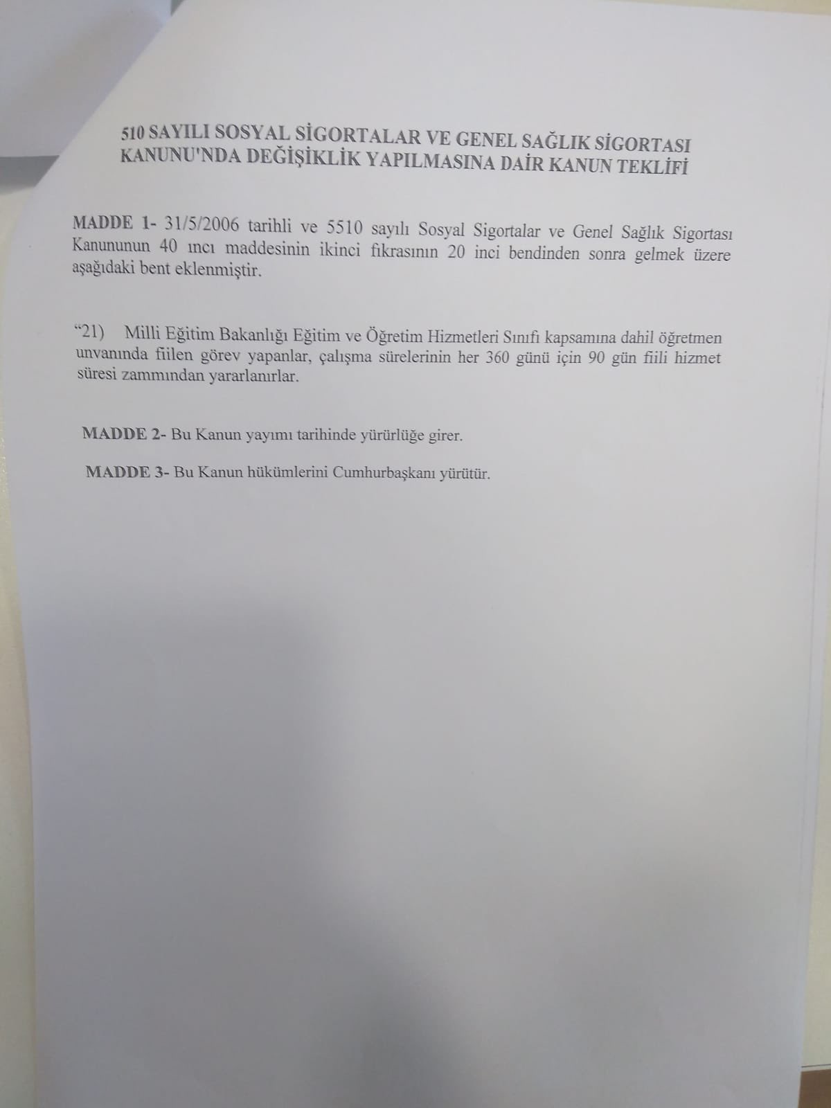 “TBMM Milli Eğitim Komisyonu üyesi ve MHP Iğdır Milletvekili Sayın Yaşar Karadağ, 5510 Sayılı Sosyal Sigortalar ve Genel Sağlık Sigortası Kanunu’nda değişiklik yapılarak, öğretmenlerimize her 360 güne 90 gün yıpranma payı verilmesi için TBMM Başkanlığı’na kanun önergesi verdi.