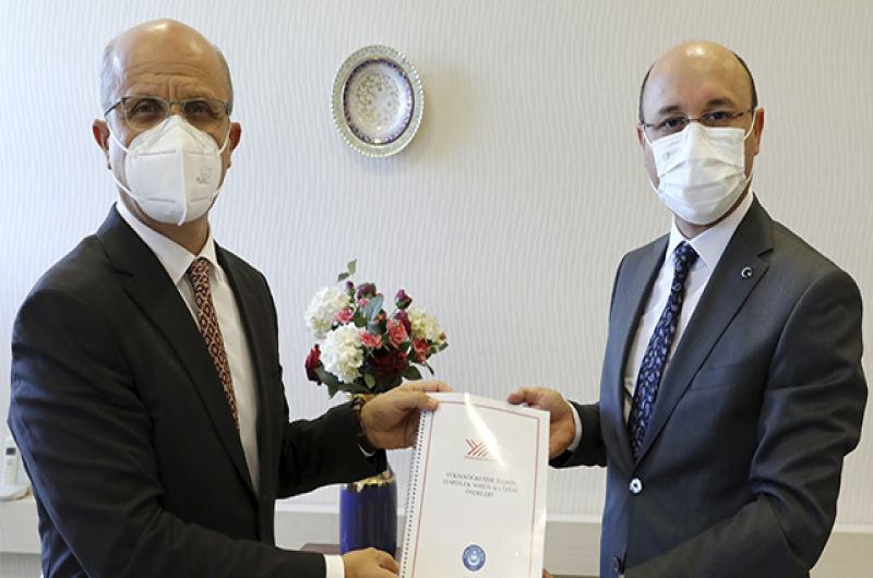 Genel Başkan Takip Geylan, YÖK Başkanı Prof. Dr. Erol Özvar’a Türk Eğitim-Sen’in hazırladığı “Yükseköğretim Kurulu Hakkında Tespitler, Sorunlar ve Çözüm Önerileri” konulu raporu da sundu.