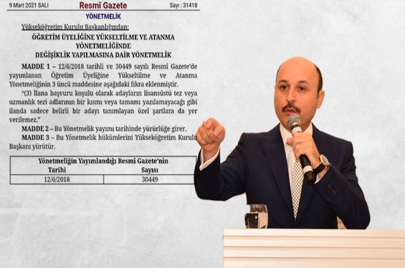 Genel Başkan açıklamasında şu ifadelere yer verdi: “ ‘Öğretim Üyeliğine Yükseltilme ve Atanma Yönetmeliğinde Değişiklik Yapılmasına Dair Yönetmelik’ yayımlandı. Buna göre yönetmeliğin 3’üncü maddesine ‘İlana başvuru koşulu olarak adayların lisansüstü tez veya uzmanlık tezi adlarının bir kısmı veya tamamı yazılamayacağı gibi ilanda sadece belirli bir adayı tanımlayan özel şartlara da yer verilemez.’ fıkrası eklenerek, ‘bir kişiyi’ işaret eden, ilanların önüne geçilmiş oldu.