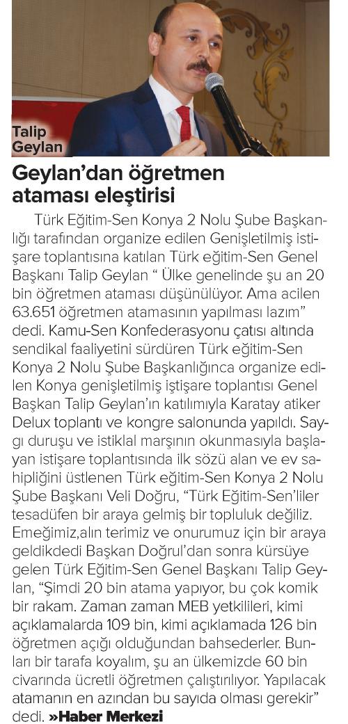 Geylan`dan Öğretmen Ataması Eleştirisi – Anadolu`da Bugün Basında TES 30 Nisan 2018 FacebookTwitterWhatsAppLinkedin A- A A+ Son Haberler Tüm Haberler NORM FAZLASI RE’SEN ATAMADA YENİ BİR YÜRÜTMEYİ DURDURMA KARARI Sendikamız üyesinin, norm kadro fazlası olduğu gerekçesiyle re’sen, aile birliği mazeretine uygun olmayan bir... 17 Şubat 2026 Haberler GENEL BAŞKAN TALİP GEYLAN GÜVEN TAZELEDİ 15 Şubat 2026 tarihinde Ankara’da yapılan Türk Eğitim-Sen 8. Olağan Merkez Genel Kurulu'nda mevcut... 15 Şubat 2026 Haberler 8. OLAĞAN MERKEZ GENEL KURULUMUZ COŞKU İLE GERÇEKLEŞTİ Türk Eğitim Sen 8. Olağan Merkez Genel Kurulu, 15 Şubat 2026 tarihinde Ankara’da coşku... 15 Şubat 2026 Haberler YÖNETİCİ GÖREVLENDİRME YÖNETMELİĞİNE DAVA AÇTIK Türk Eğitim Sen, 30.01.2026 tarih ve 33153 sayılı resmi gazete yayımlanan Milli Eğitim Bakanlığı... 12 Şubat 2026