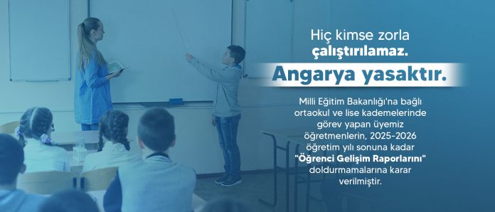 Bu gerekçeler doğrultusunda Türk Eğitim Sen Genel Merkezi olarak, öğretmenlerimizin üzerindeki gereksiz kırtasiyecilik ve angarya iş yükünün kaldırılması, hukuka aykırı uygulamanın sonlandırılması amacıyla; Milli Eğitim Bakanlığı’na bağlı ortaokul ve lise kademelerinde görev yapan üyemiz öğretmenlerin, 2025-2026 öğretim yılı sonuna kadar “Öğrenci Gelişim Raporlarını” doldurmamalarına karar verilmiştir.