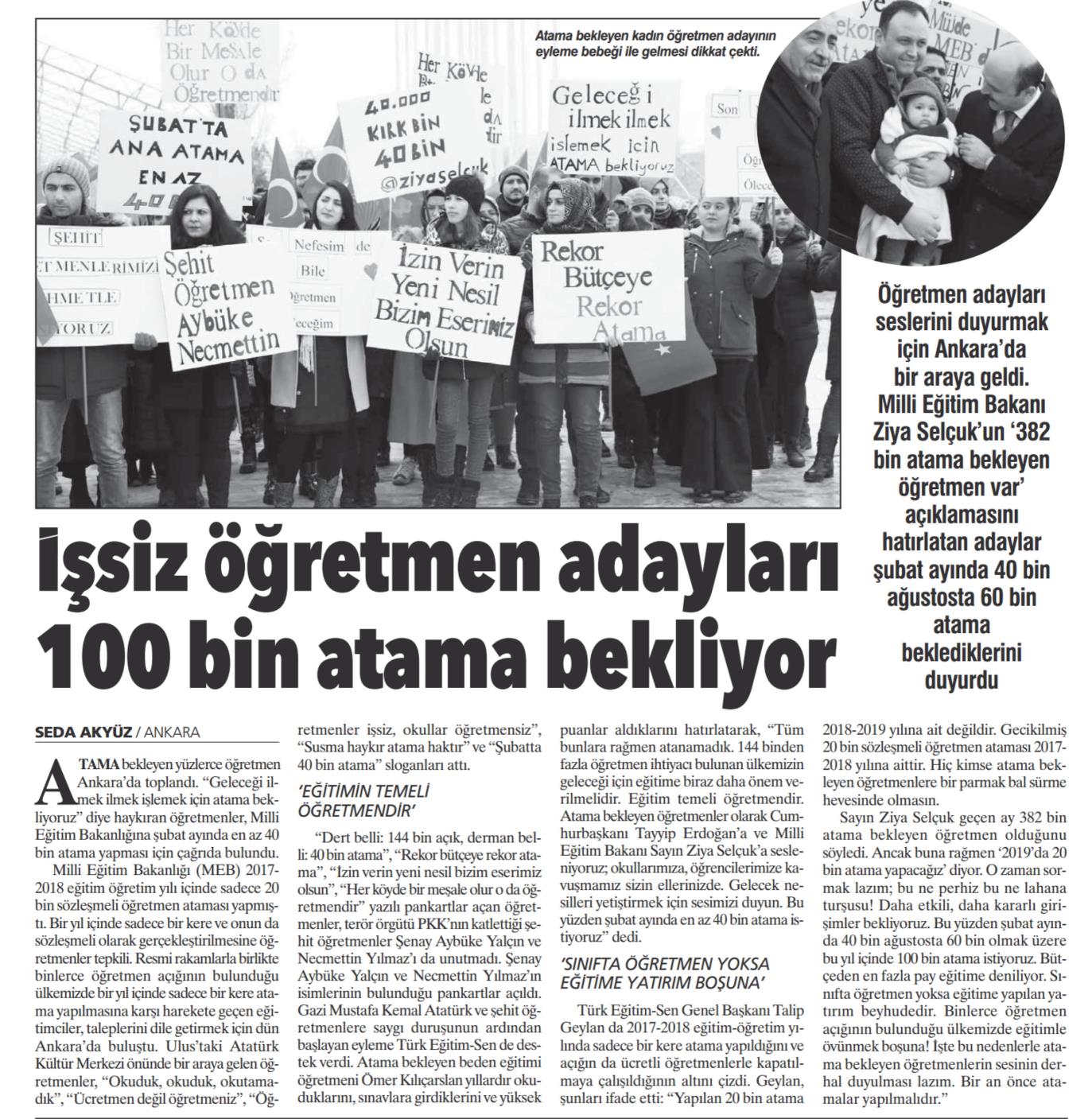 İşsiz Öğretmen Adayları 100 Bin Atama Bekliyor – Aydınlık Basında TES 24 Ocak 2019 FacebookTwitterWhatsAppLinkedin A- A A+ Son Haberler Tüm Haberler NORM FAZLASI RE’SEN ATAMADA YENİ BİR YÜRÜTMEYİ DURDURMA KARARI Sendikamız üyesinin, norm kadro fazlası olduğu gerekçesiyle re’sen, aile birliği mazeretine uygun olmayan bir... 17 Şubat 2026 Haberler GENEL BAŞKAN TALİP GEYLAN GÜVEN TAZELEDİ 15 Şubat 2026 tarihinde Ankara’da yapılan Türk Eğitim-Sen 8. Olağan Merkez Genel Kurulu'nda mevcut... 15 Şubat 2026 Haberler 8. OLAĞAN MERKEZ GENEL KURULUMUZ COŞKU İLE GERÇEKLEŞTİ Türk Eğitim Sen 8. Olağan Merkez Genel Kurulu, 15 Şubat 2026 tarihinde Ankara’da coşku... 15 Şubat 2026 Haberler YÖNETİCİ GÖREVLENDİRME YÖNETMELİĞİNE DAVA AÇTIK Türk Eğitim Sen, 30.01.2026 tarih ve 33153 sayılı resmi gazete yayımlanan Milli Eğitim Bakanlığı... 12 Şubat 2026