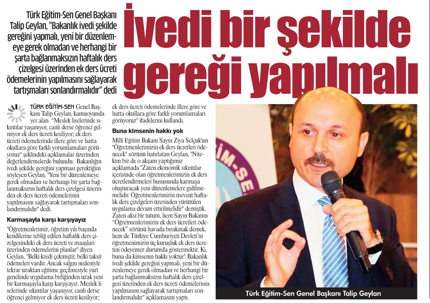 İvedi Bir Şekilde Gereği Yapılmalı – Gazete Damga Basında TES 2 Aralık 2020 FacebookTwitterWhatsAppLinkedin A- A A+ Son Haberler Haberler YÖNETİCİ GÖREVLENDİRME YÖNETMELİĞİNE DAVA AÇTIK Türk Eğitim Sen, 30.01.2026 tarih ve 33153 sayılı resmi gazete yayımlanan Milli Eğitim Bakanlığı... 12 Şubat 2026 Haberler IRAK TÜRKMEN EĞİTİMCİLERİNDEN GENEL BAŞKAN TALİP GEYLAN’A ANLAMLI ZİYARET Irak Türkmen Eğitimciler Öğretmen Örgütü Başkanı Ali Gülboy ve beraberindeki heyet, 11 Şubat 2026... 11 Şubat 2026 Haberler ÖZEL EĞİTİM ANAOKULLARINDA GÖREV YAPAN ÖZEL EĞİTİM ÖĞRETMENLERİNE DE HAFTADA 1 SAAT EK DERS... 11 Şubat 2026 Haberler TÜRK EĞİTİM SEN ÜYELERİNE;MEB EKYS 2026 YAZILI SINAVINA HAZIRLIK DUYURUSU 2026 yılı Millî Eğitim Bakanlığı Eğitim Kurumlarına Yönetici Seçme Sınavı (MEB EKYS) kapsamında uygulanacak... 10 Şubat 2026