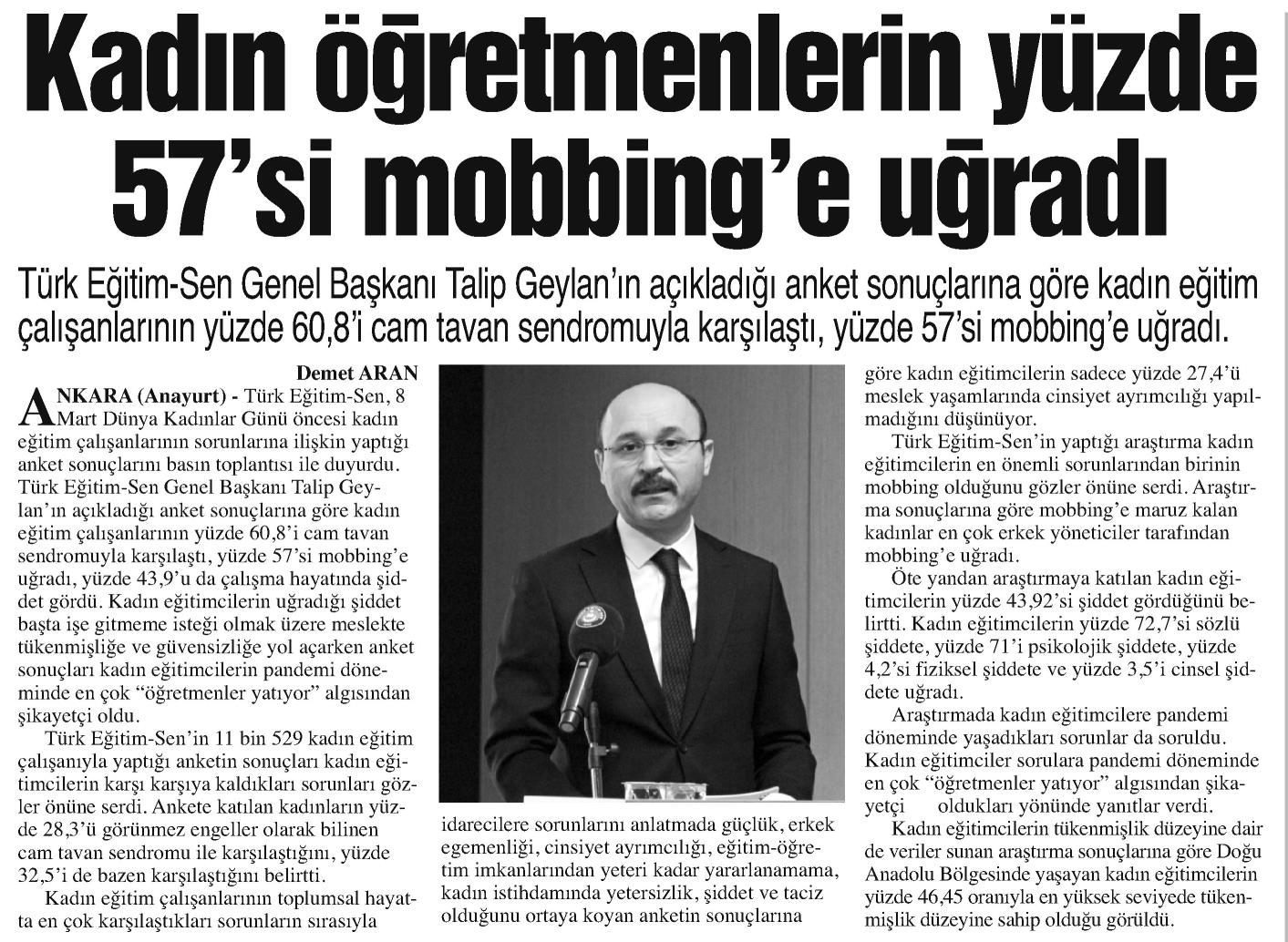 Kadın Öğretmenlerin Yüzde 57`si Mobinge Uğradı – Anayurt Basında TES 6 Mart 2021 FacebookTwitterWhatsAppLinkedin A- A A+ Son Haberler Haberler YÖNETİCİ GÖREVLENDİRME YÖNETMELİĞİNE DAVA AÇTIK Türk Eğitim Sen, 30.01.2026 tarih ve 33153 sayılı resmi gazete yayımlanan Milli Eğitim Bakanlığı... 12 Şubat 2026 Haberler IRAK TÜRKMEN EĞİTİMCİLERİNDEN GENEL BAŞKAN TALİP GEYLAN’A ANLAMLI ZİYARET Irak Türkmen Eğitimciler Öğretmen Örgütü Başkanı Ali Gülboy ve beraberindeki heyet, 11 Şubat 2026... 11 Şubat 2026 Haberler ÖZEL EĞİTİM ANAOKULLARINDA GÖREV YAPAN ÖZEL EĞİTİM ÖĞRETMENLERİNE DE HAFTADA 1 SAAT EK DERS... 11 Şubat 2026 Haberler TÜRK EĞİTİM SEN ÜYELERİNE;MEB EKYS 2026 YAZILI SINAVINA HAZIRLIK DUYURUSU 2026 yılı Millî Eğitim Bakanlığı Eğitim Kurumlarına Yönetici Seçme Sınavı (MEB EKYS) kapsamında uygulanacak... 10 Şubat 2026