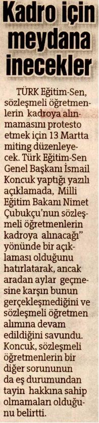 Kadro İçin Meydana İnecekler – Hürriyet Ankara Basında TES 14 Şubat 2010 FacebookTwitterWhatsAppLinkedin A- A A+ Son Haberler Tüm Haberler NORM FAZLASI RE’SEN ATAMADA YENİ BİR YÜRÜTMEYİ DURDURMA KARARI Sendikamız üyesinin, norm kadro fazlası olduğu gerekçesiyle re’sen, aile birliği mazeretine uygun olmayan bir... 17 Şubat 2026 Haberler GENEL BAŞKAN TALİP GEYLAN GÜVEN TAZELEDİ 15 Şubat 2026 tarihinde Ankara’da yapılan Türk Eğitim-Sen 8. Olağan Merkez Genel Kurulu'nda mevcut... 15 Şubat 2026 Haberler 8. OLAĞAN MERKEZ GENEL KURULUMUZ COŞKU İLE GERÇEKLEŞTİ Türk Eğitim Sen 8. Olağan Merkez Genel Kurulu, 15 Şubat 2026 tarihinde Ankara’da coşku... 15 Şubat 2026 Haberler YÖNETİCİ GÖREVLENDİRME YÖNETMELİĞİNE DAVA AÇTIK Türk Eğitim Sen, 30.01.2026 tarih ve 33153 sayılı resmi gazete yayımlanan Milli Eğitim Bakanlığı... 12 Şubat 2026