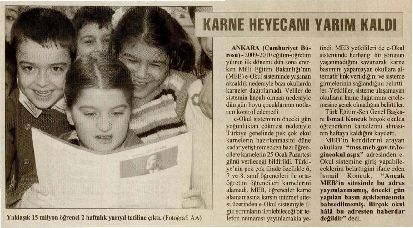 Karne Heyecanı Yarım Kaldı – Cumhuriyet Basında TES 23 Ocak 2010 FacebookTwitterWhatsAppLinkedin A- A A+ Son Haberler Tüm Haberler NORM FAZLASI RE’SEN ATAMADA YENİ BİR YÜRÜTMEYİ DURDURMA KARARI Sendikamız üyesinin, norm kadro fazlası olduğu gerekçesiyle re’sen, aile birliği mazeretine uygun olmayan bir... 17 Şubat 2026 Haberler GENEL BAŞKAN TALİP GEYLAN GÜVEN TAZELEDİ 15 Şubat 2026 tarihinde Ankara’da yapılan Türk Eğitim-Sen 8. Olağan Merkez Genel Kurulu'nda mevcut... 15 Şubat 2026 Haberler 8. OLAĞAN MERKEZ GENEL KURULUMUZ COŞKU İLE GERÇEKLEŞTİ Türk Eğitim Sen 8. Olağan Merkez Genel Kurulu, 15 Şubat 2026 tarihinde Ankara’da coşku... 15 Şubat 2026 Haberler YÖNETİCİ GÖREVLENDİRME YÖNETMELİĞİNE DAVA AÇTIK Türk Eğitim Sen, 30.01.2026 tarih ve 33153 sayılı resmi gazete yayımlanan Milli Eğitim Bakanlığı... 12 Şubat 2026