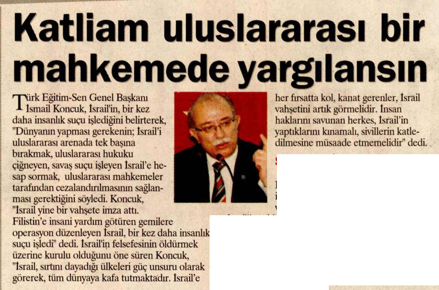 Katliam Uluslararası Bir Mahkemede Yargılansın – Yeni Şafak Basında TES 1 Haziran 2010 FacebookTwitterWhatsAppLinkedin A- A A+ Son Haberler Haberler TÜRK DÜNYASINDA EĞİTİM ALANINDA İŞBİRLİĞİ SÜRÜYOR Türk Eğitim-Sen ve Uluslararası Avrasya Eğitim Sendikaları Birliği Genel Başkanı Talip Geylan ile Kırgızistan... 19 Şubat 2026 Tüm Haberler NORM FAZLASI RE’SEN ATAMADA YENİ BİR YÜRÜTMEYİ DURDURMA KARARI Sendikamız üyesinin, norm kadro fazlası olduğu gerekçesiyle re’sen, aile birliği mazeretine uygun olmayan bir... 17 Şubat 2026 Haberler GENEL BAŞKAN TALİP GEYLAN GÜVEN TAZELEDİ 15 Şubat 2026 tarihinde Ankara’da yapılan Türk Eğitim-Sen 8. Olağan Merkez Genel Kurulu'nda mevcut... 15 Şubat 2026 Haberler 8. OLAĞAN MERKEZ GENEL KURULUMUZ COŞKU İLE GERÇEKLEŞTİ Türk Eğitim Sen 8. Olağan Merkez Genel Kurulu, 15 Şubat 2026 tarihinde Ankara’da coşku... 15 Şubat 2026