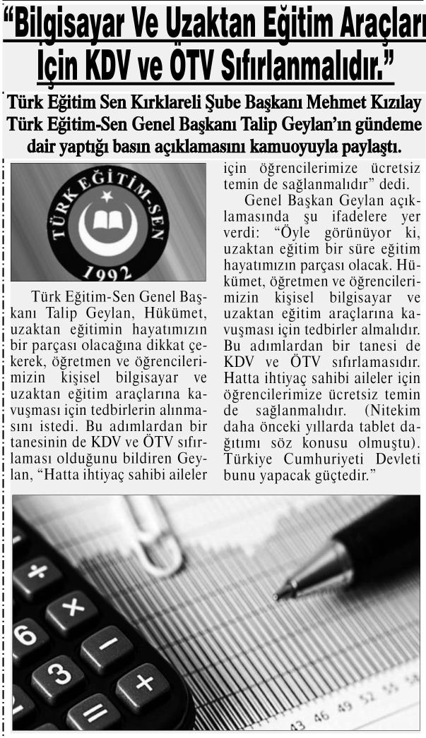 KDV ve ÖTV Sıfırlanmalı – Demirköy İğneada Basında TES 9 Eylül 2020 FacebookTwitterWhatsAppLinkedin A- A A+ Son Haberler Haberler YÖNETİCİ GÖREVLENDİRME YÖNETMELİĞİNE DAVA AÇTIK Türk Eğitim Sen, 30.01.2026 tarih ve 33153 sayılı resmi gazete yayımlanan Milli Eğitim Bakanlığı... 12 Şubat 2026 Haberler IRAK TÜRKMEN EĞİTİMCİLERİNDEN GENEL BAŞKAN TALİP GEYLAN’A ANLAMLI ZİYARET Irak Türkmen Eğitimciler Öğretmen Örgütü Başkanı Ali Gülboy ve beraberindeki heyet, 11 Şubat 2026... 11 Şubat 2026 Haberler ÖZEL EĞİTİM ANAOKULLARINDA GÖREV YAPAN ÖZEL EĞİTİM ÖĞRETMENLERİNE DE HAFTADA 1 SAAT EK DERS... 11 Şubat 2026 Haberler TÜRK EĞİTİM SEN ÜYELERİNE;MEB EKYS 2026 YAZILI SINAVINA HAZIRLIK DUYURUSU 2026 yılı Millî Eğitim Bakanlığı Eğitim Kurumlarına Yönetici Seçme Sınavı (MEB EKYS) kapsamında uygulanacak... 10 Şubat 2026