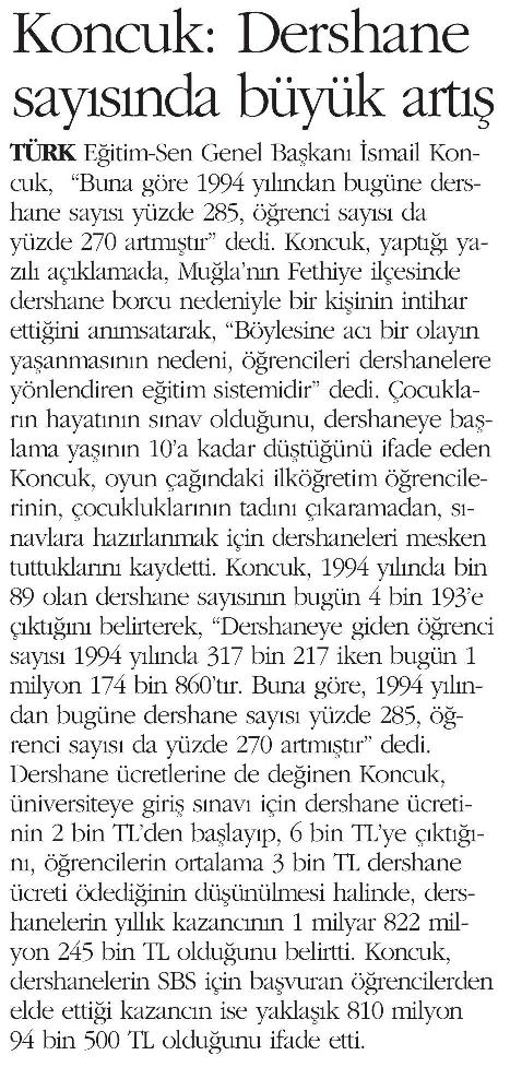 Koncuk : Dershane Sayısında Büyük Artış – Ortadoğu Basında TES 7 Nisan 2010 FacebookTwitterWhatsAppLinkedin A- A A+ Son Haberler Haberler TÜRK DÜNYASINDA EĞİTİM ALANINDA İŞBİRLİĞİ SÜRÜYOR Türk Eğitim-Sen ve Uluslararası Avrasya Eğitim Sendikaları Birliği Genel Başkanı Talip Geylan ile Kırgızistan... 19 Şubat 2026 Tüm Haberler NORM FAZLASI RE’SEN ATAMADA YENİ BİR YÜRÜTMEYİ DURDURMA KARARI Sendikamız üyesinin, norm kadro fazlası olduğu gerekçesiyle re’sen, aile birliği mazeretine uygun olmayan bir... 17 Şubat 2026 Haberler GENEL BAŞKAN TALİP GEYLAN GÜVEN TAZELEDİ 15 Şubat 2026 tarihinde Ankara’da yapılan Türk Eğitim-Sen 8. Olağan Merkez Genel Kurulu'nda mevcut... 15 Şubat 2026 Haberler 8. OLAĞAN MERKEZ GENEL KURULUMUZ COŞKU İLE GERÇEKLEŞTİ Türk Eğitim Sen 8. Olağan Merkez Genel Kurulu, 15 Şubat 2026 tarihinde Ankara’da coşku... 15 Şubat 2026