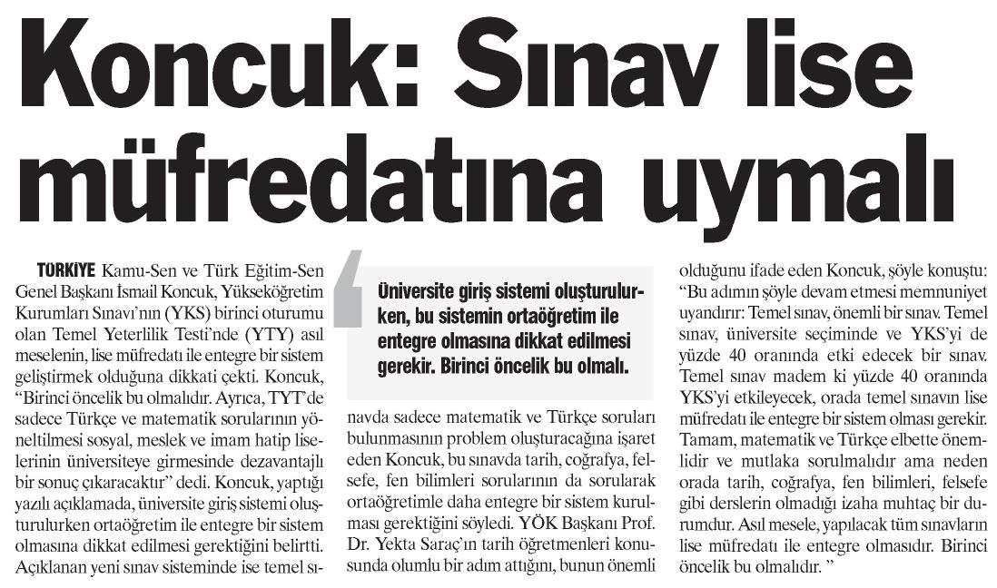 Koncuk: Sınav Lise Müfredatına Uymalı – Türkiye Yeni Çağ Basında TES 26 Ekim 2017 FacebookTwitterWhatsAppLinkedin A- A A+ Son Haberler Tüm Haberler NORM FAZLASI RE’SEN ATAMADA YENİ BİR YÜRÜTMEYİ DURDURMA KARARI Sendikamız üyesinin, norm kadro fazlası olduğu gerekçesiyle re’sen, aile birliği mazeretine uygun olmayan bir... 17 Şubat 2026 Haberler GENEL BAŞKAN TALİP GEYLAN GÜVEN TAZELEDİ 15 Şubat 2026 tarihinde Ankara’da yapılan Türk Eğitim-Sen 8. Olağan Merkez Genel Kurulu'nda mevcut... 15 Şubat 2026 Haberler 8. OLAĞAN MERKEZ GENEL KURULUMUZ COŞKU İLE GERÇEKLEŞTİ Türk Eğitim Sen 8. Olağan Merkez Genel Kurulu, 15 Şubat 2026 tarihinde Ankara’da coşku... 15 Şubat 2026 Haberler YÖNETİCİ GÖREVLENDİRME YÖNETMELİĞİNE DAVA AÇTIK Türk Eğitim Sen, 30.01.2026 tarih ve 33153 sayılı resmi gazete yayımlanan Milli Eğitim Bakanlığı... 12 Şubat 2026