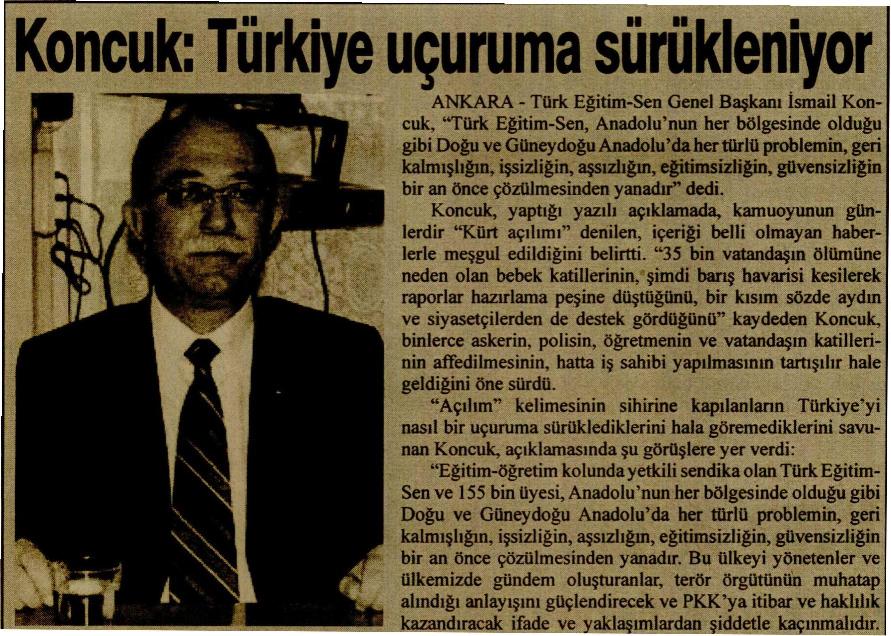 Koncuk: Türkiye Uçuruma Sürükleniyor – Gündem Basında TES 5 Ağustos 2009 FacebookTwitterWhatsAppLinkedin A- A A+ Son Haberler Haberler GENEL BAŞKAN TALİP GEYLAN GÜVEN TAZELEDİ 15 Şubat 2026 tarihinde Ankara’da yapılan Türk Eğitim-Sen 8. Olağan Merkez Genel Kurulu'nda mevcut... 15 Şubat 2026 Haberler 8. OLAĞAN MERKEZ GENEL KURULUMUZ COŞKU İLE GERÇEKLEŞTİ Türk Eğitim Sen 8. Olağan Merkez Genel Kurulu, 15 Şubat 2026 tarihinde Ankara’da coşku... 15 Şubat 2026 Haberler YÖNETİCİ GÖREVLENDİRME YÖNETMELİĞİNE DAVA AÇTIK Türk Eğitim Sen, 30.01.2026 tarih ve 33153 sayılı resmi gazete yayımlanan Milli Eğitim Bakanlığı... 12 Şubat 2026 Haberler IRAK TÜRKMEN EĞİTİMCİLERİNDEN GENEL BAŞKAN TALİP GEYLAN’A ANLAMLI ZİYARET Irak Türkmen Eğitimciler Öğretmen Örgütü Başkanı Ali Gülboy ve beraberindeki heyet, 11 Şubat 2026... 11 Şubat 2026
