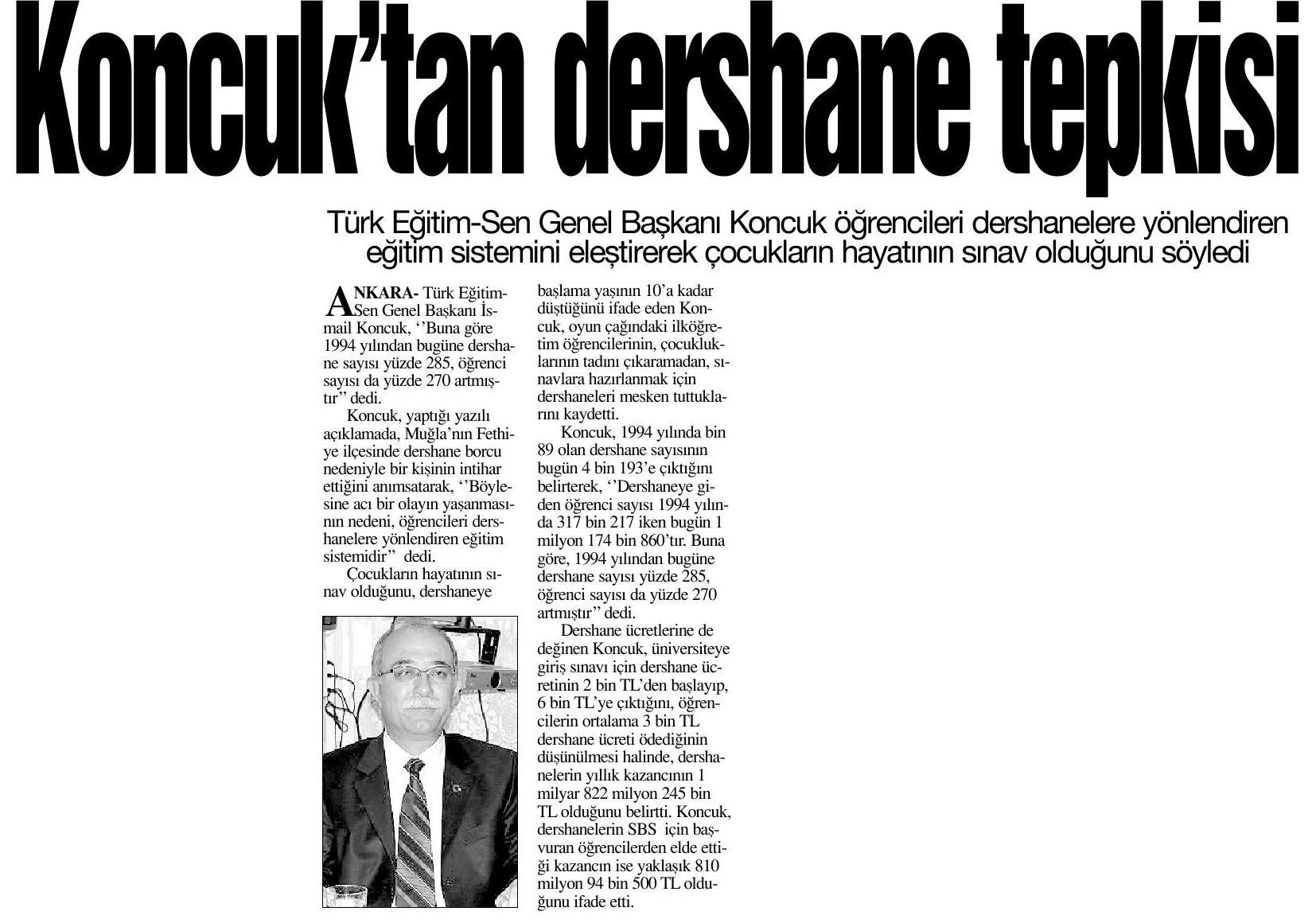 Koncuk’tan Dershane Tepkisi – Anayurt Basında TES 7 Nisan 2010 FacebookTwitterWhatsAppLinkedin A- A A+ Son Haberler Haberler TÜRK DÜNYASINDA EĞİTİM ALANINDA İŞBİRLİĞİ SÜRÜYOR Türk Eğitim-Sen ve Uluslararası Avrasya Eğitim Sendikaları Birliği Genel Başkanı Talip Geylan ile Kırgızistan... 19 Şubat 2026 Tüm Haberler NORM FAZLASI RE’SEN ATAMADA YENİ BİR YÜRÜTMEYİ DURDURMA KARARI Sendikamız üyesinin, norm kadro fazlası olduğu gerekçesiyle re’sen, aile birliği mazeretine uygun olmayan bir... 17 Şubat 2026 Haberler GENEL BAŞKAN TALİP GEYLAN GÜVEN TAZELEDİ 15 Şubat 2026 tarihinde Ankara’da yapılan Türk Eğitim-Sen 8. Olağan Merkez Genel Kurulu'nda mevcut... 15 Şubat 2026 Haberler 8. OLAĞAN MERKEZ GENEL KURULUMUZ COŞKU İLE GERÇEKLEŞTİ Türk Eğitim Sen 8. Olağan Merkez Genel Kurulu, 15 Şubat 2026 tarihinde Ankara’da coşku... 15 Şubat 2026
