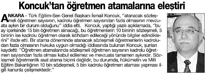 Koncuk’tan Öğretmen Atamalarına Eleştiri – Anayurt Basında TES 10 Ağustos 2009 FacebookTwitterWhatsAppLinkedin A- A A+ Son Haberler Haberler GENEL BAŞKAN TALİP GEYLAN GÜVEN TAZELEDİ 15 Şubat 2026 tarihinde Ankara’da yapılan Türk Eğitim-Sen 8. Olağan Merkez Genel Kurulu'nda mevcut... 15 Şubat 2026 Haberler 8. OLAĞAN MERKEZ GENEL KURULUMUZ COŞKU İLE GERÇEKLEŞTİ Türk Eğitim Sen 8. Olağan Merkez Genel Kurulu, 15 Şubat 2026 tarihinde Ankara’da coşku... 15 Şubat 2026 Haberler YÖNETİCİ GÖREVLENDİRME YÖNETMELİĞİNE DAVA AÇTIK Türk Eğitim Sen, 30.01.2026 tarih ve 33153 sayılı resmi gazete yayımlanan Milli Eğitim Bakanlığı... 12 Şubat 2026 Haberler IRAK TÜRKMEN EĞİTİMCİLERİNDEN GENEL BAŞKAN TALİP GEYLAN’A ANLAMLI ZİYARET Irak Türkmen Eğitimciler Öğretmen Örgütü Başkanı Ali Gülboy ve beraberindeki heyet, 11 Şubat 2026... 11 Şubat 2026