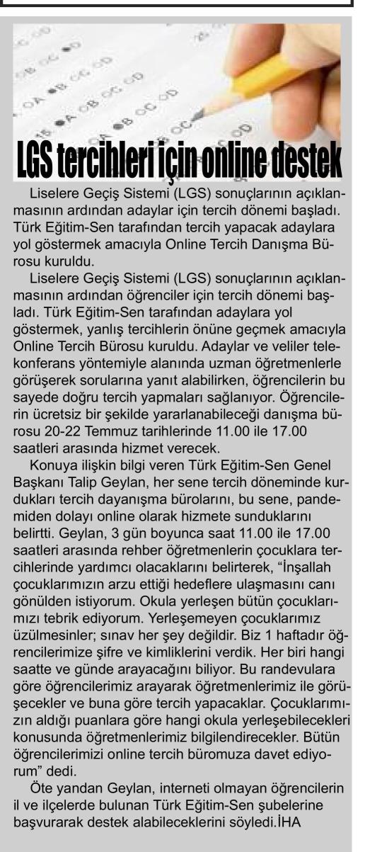 LGS Tercihleri İçin Online Destek – Yeni Adım Basında TES 21 Temmuz 2020 FacebookTwitterWhatsAppLinkedin A- A A+ Son Haberler Haberler YÖNETİCİ GÖREVLENDİRME YÖNETMELİĞİNE DAVA AÇTIK Türk Eğitim Sen, 30.01.2026 tarih ve 33153 sayılı resmi gazete yayımlanan Milli Eğitim Bakanlığı... 12 Şubat 2026 Haberler IRAK TÜRKMEN EĞİTİMCİLERİNDEN GENEL BAŞKAN TALİP GEYLAN’A ANLAMLI ZİYARET Irak Türkmen Eğitimciler Öğretmen Örgütü Başkanı Ali Gülboy ve beraberindeki heyet, 11 Şubat 2026... 11 Şubat 2026 Haberler ÖZEL EĞİTİM ANAOKULLARINDA GÖREV YAPAN ÖZEL EĞİTİM ÖĞRETMENLERİNE DE HAFTADA 1 SAAT EK DERS... 11 Şubat 2026 Haberler TÜRK EĞİTİM SEN ÜYELERİNE;MEB EKYS 2026 YAZILI SINAVINA HAZIRLIK DUYURUSU 2026 yılı Millî Eğitim Bakanlığı Eğitim Kurumlarına Yönetici Seçme Sınavı (MEB EKYS) kapsamında uygulanacak... 10 Şubat 2026