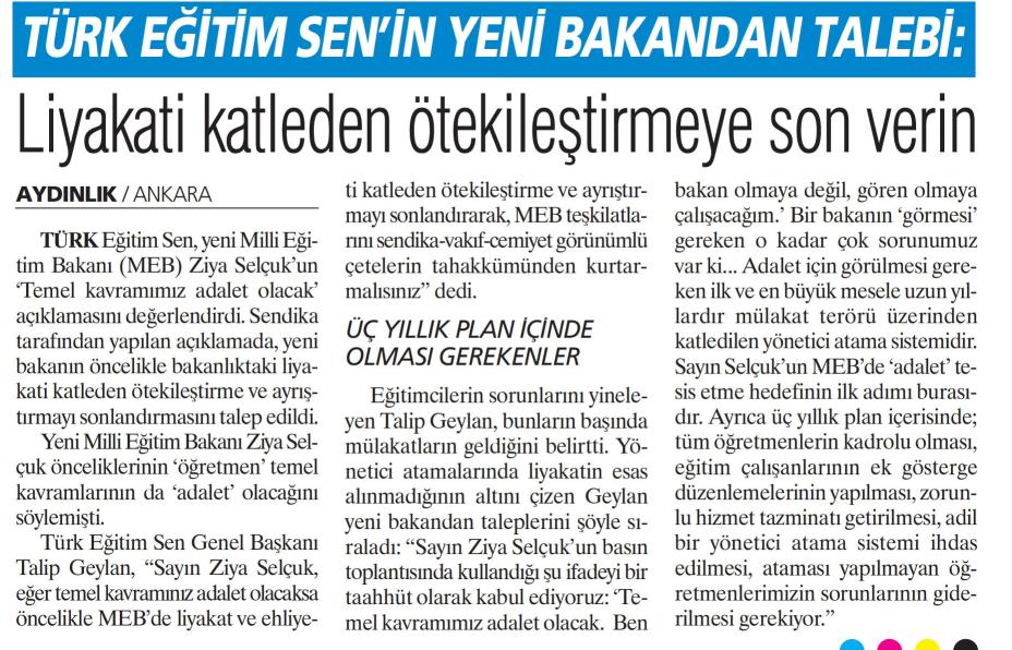 Liyakati Katleden Ötekileştirmeye Son Verin – Aydınlık Basında TES 24 Temmuz 2018 FacebookTwitterWhatsAppLinkedin A- A A+ Son Haberler Tüm Haberler NORM FAZLASI RE’SEN ATAMADA YENİ BİR YÜRÜTMEYİ DURDURMA KARARI Sendikamız üyesinin, norm kadro fazlası olduğu gerekçesiyle re’sen, aile birliği mazeretine uygun olmayan bir... 17 Şubat 2026 Haberler GENEL BAŞKAN TALİP GEYLAN GÜVEN TAZELEDİ 15 Şubat 2026 tarihinde Ankara’da yapılan Türk Eğitim-Sen 8. Olağan Merkez Genel Kurulu'nda mevcut... 15 Şubat 2026 Haberler 8. OLAĞAN MERKEZ GENEL KURULUMUZ COŞKU İLE GERÇEKLEŞTİ Türk Eğitim Sen 8. Olağan Merkez Genel Kurulu, 15 Şubat 2026 tarihinde Ankara’da coşku... 15 Şubat 2026 Haberler YÖNETİCİ GÖREVLENDİRME YÖNETMELİĞİNE DAVA AÇTIK Türk Eğitim Sen, 30.01.2026 tarih ve 33153 sayılı resmi gazete yayımlanan Milli Eğitim Bakanlığı... 12 Şubat 2026