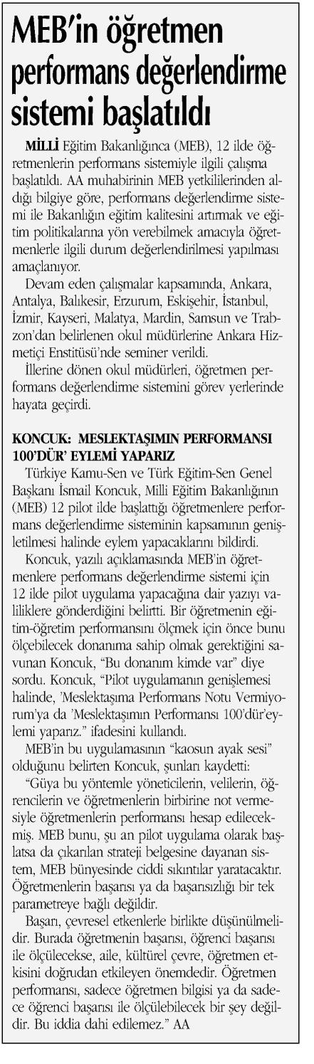 MEB`in Öğretmen Performans Değerlendirme Sistemi Başladı – Ortadoğu Basında TES 26 Ekim 2017 FacebookTwitterWhatsAppLinkedin A- A A+ Son Haberler Tüm Haberler NORM FAZLASI RE’SEN ATAMADA YENİ BİR YÜRÜTMEYİ DURDURMA KARARI Sendikamız üyesinin, norm kadro fazlası olduğu gerekçesiyle re’sen, aile birliği mazeretine uygun olmayan bir... 17 Şubat 2026 Haberler GENEL BAŞKAN TALİP GEYLAN GÜVEN TAZELEDİ 15 Şubat 2026 tarihinde Ankara’da yapılan Türk Eğitim-Sen 8. Olağan Merkez Genel Kurulu'nda mevcut... 15 Şubat 2026 Haberler 8. OLAĞAN MERKEZ GENEL KURULUMUZ COŞKU İLE GERÇEKLEŞTİ Türk Eğitim Sen 8. Olağan Merkez Genel Kurulu, 15 Şubat 2026 tarihinde Ankara’da coşku... 15 Şubat 2026 Haberler YÖNETİCİ GÖREVLENDİRME YÖNETMELİĞİNE DAVA AÇTIK Türk Eğitim Sen, 30.01.2026 tarih ve 33153 sayılı resmi gazete yayımlanan Milli Eğitim Bakanlığı... 12 Şubat 2026