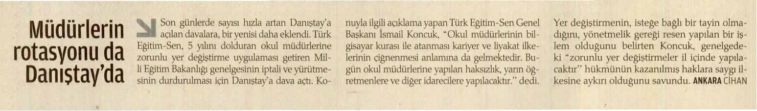 Müdürlerin Rotasyonu da Danıştay’da – Zaman Basında TES 25 Temmuz 2010 FacebookTwitterWhatsAppLinkedin A- A A+ Son Haberler Haberler TÜRK DÜNYASINDA EĞİTİM ALANINDA İŞBİRLİĞİ SÜRÜYOR Türk Eğitim-Sen ve Uluslararası Avrasya Eğitim Sendikaları Birliği Genel Başkanı Talip Geylan ile Kırgızistan... 19 Şubat 2026 Tüm Haberler NORM FAZLASI RE’SEN ATAMADA YENİ BİR YÜRÜTMEYİ DURDURMA KARARI Sendikamız üyesinin, norm kadro fazlası olduğu gerekçesiyle re’sen, aile birliği mazeretine uygun olmayan bir... 17 Şubat 2026 Haberler GENEL BAŞKAN TALİP GEYLAN GÜVEN TAZELEDİ 15 Şubat 2026 tarihinde Ankara’da yapılan Türk Eğitim-Sen 8. Olağan Merkez Genel Kurulu'nda mevcut... 15 Şubat 2026 Haberler 8. OLAĞAN MERKEZ GENEL KURULUMUZ COŞKU İLE GERÇEKLEŞTİ Türk Eğitim Sen 8. Olağan Merkez Genel Kurulu, 15 Şubat 2026 tarihinde Ankara’da coşku... 15 Şubat 2026