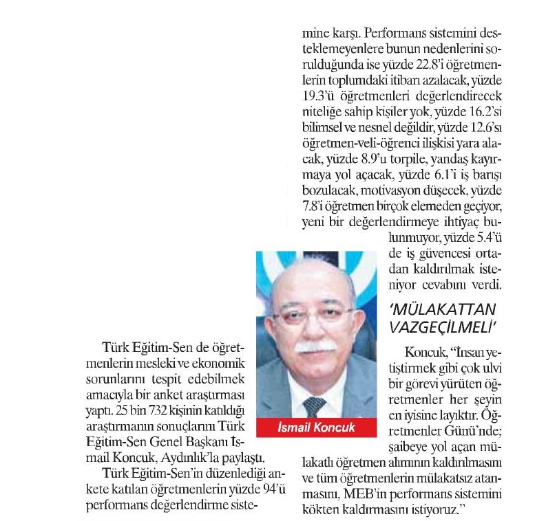 Mülakattan Vazgeçilmeli – Aydınlık Basında TES 24 Kasım 2017 FacebookTwitterWhatsAppLinkedin A- A A+ Son Haberler Tüm Haberler NORM FAZLASI RE’SEN ATAMADA YENİ BİR YÜRÜTMEYİ DURDURMA KARARI Sendikamız üyesinin, norm kadro fazlası olduğu gerekçesiyle re’sen, aile birliği mazeretine uygun olmayan bir... 17 Şubat 2026 Haberler GENEL BAŞKAN TALİP GEYLAN GÜVEN TAZELEDİ 15 Şubat 2026 tarihinde Ankara’da yapılan Türk Eğitim-Sen 8. Olağan Merkez Genel Kurulu'nda mevcut... 15 Şubat 2026 Haberler 8. OLAĞAN MERKEZ GENEL KURULUMUZ COŞKU İLE GERÇEKLEŞTİ Türk Eğitim Sen 8. Olağan Merkez Genel Kurulu, 15 Şubat 2026 tarihinde Ankara’da coşku... 15 Şubat 2026 Haberler YÖNETİCİ GÖREVLENDİRME YÖNETMELİĞİNE DAVA AÇTIK Türk Eğitim Sen, 30.01.2026 tarih ve 33153 sayılı resmi gazete yayımlanan Milli Eğitim Bakanlığı... 12 Şubat 2026