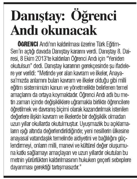 Öğrenci Andı Okutulacak – Türkiye Yeni Çağ Basında TES 19 Ekim 2018 FacebookTwitterWhatsAppLinkedin A- A A+ Son Haberler Tüm Haberler NORM FAZLASI RE’SEN ATAMADA YENİ BİR YÜRÜTMEYİ DURDURMA KARARI Sendikamız üyesinin, norm kadro fazlası olduğu gerekçesiyle re’sen, aile birliği mazeretine uygun olmayan bir... 17 Şubat 2026 Haberler GENEL BAŞKAN TALİP GEYLAN GÜVEN TAZELEDİ 15 Şubat 2026 tarihinde Ankara’da yapılan Türk Eğitim-Sen 8. Olağan Merkez Genel Kurulu'nda mevcut... 15 Şubat 2026 Haberler 8. OLAĞAN MERKEZ GENEL KURULUMUZ COŞKU İLE GERÇEKLEŞTİ Türk Eğitim Sen 8. Olağan Merkez Genel Kurulu, 15 Şubat 2026 tarihinde Ankara’da coşku... 15 Şubat 2026 Haberler YÖNETİCİ GÖREVLENDİRME YÖNETMELİĞİNE DAVA AÇTIK Türk Eğitim Sen, 30.01.2026 tarih ve 33153 sayılı resmi gazete yayımlanan Milli Eğitim Bakanlığı... 12 Şubat 2026