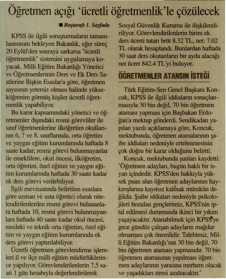 Öğretmen Açığı ‘Ücretli Öğretmenlik’le Çözülecek – Bizim Gazete Basında TES 3 Eylül 2010 FacebookTwitterWhatsAppLinkedin A- A A+ Son Haberler Haberler TÜRK DÜNYASINDA EĞİTİM ALANINDA İŞBİRLİĞİ SÜRÜYOR Türk Eğitim-Sen ve Uluslararası Avrasya Eğitim Sendikaları Birliği Genel Başkanı Talip Geylan ile Kırgızistan... 19 Şubat 2026 Tüm Haberler NORM FAZLASI RE’SEN ATAMADA YENİ BİR YÜRÜTMEYİ DURDURMA KARARI Sendikamız üyesinin, norm kadro fazlası olduğu gerekçesiyle re’sen, aile birliği mazeretine uygun olmayan bir... 17 Şubat 2026 Haberler GENEL BAŞKAN TALİP GEYLAN GÜVEN TAZELEDİ 15 Şubat 2026 tarihinde Ankara’da yapılan Türk Eğitim-Sen 8. Olağan Merkez Genel Kurulu'nda mevcut... 15 Şubat 2026 Haberler 8. OLAĞAN MERKEZ GENEL KURULUMUZ COŞKU İLE GERÇEKLEŞTİ Türk Eğitim Sen 8. Olağan Merkez Genel Kurulu, 15 Şubat 2026 tarihinde Ankara’da coşku... 15 Şubat 2026